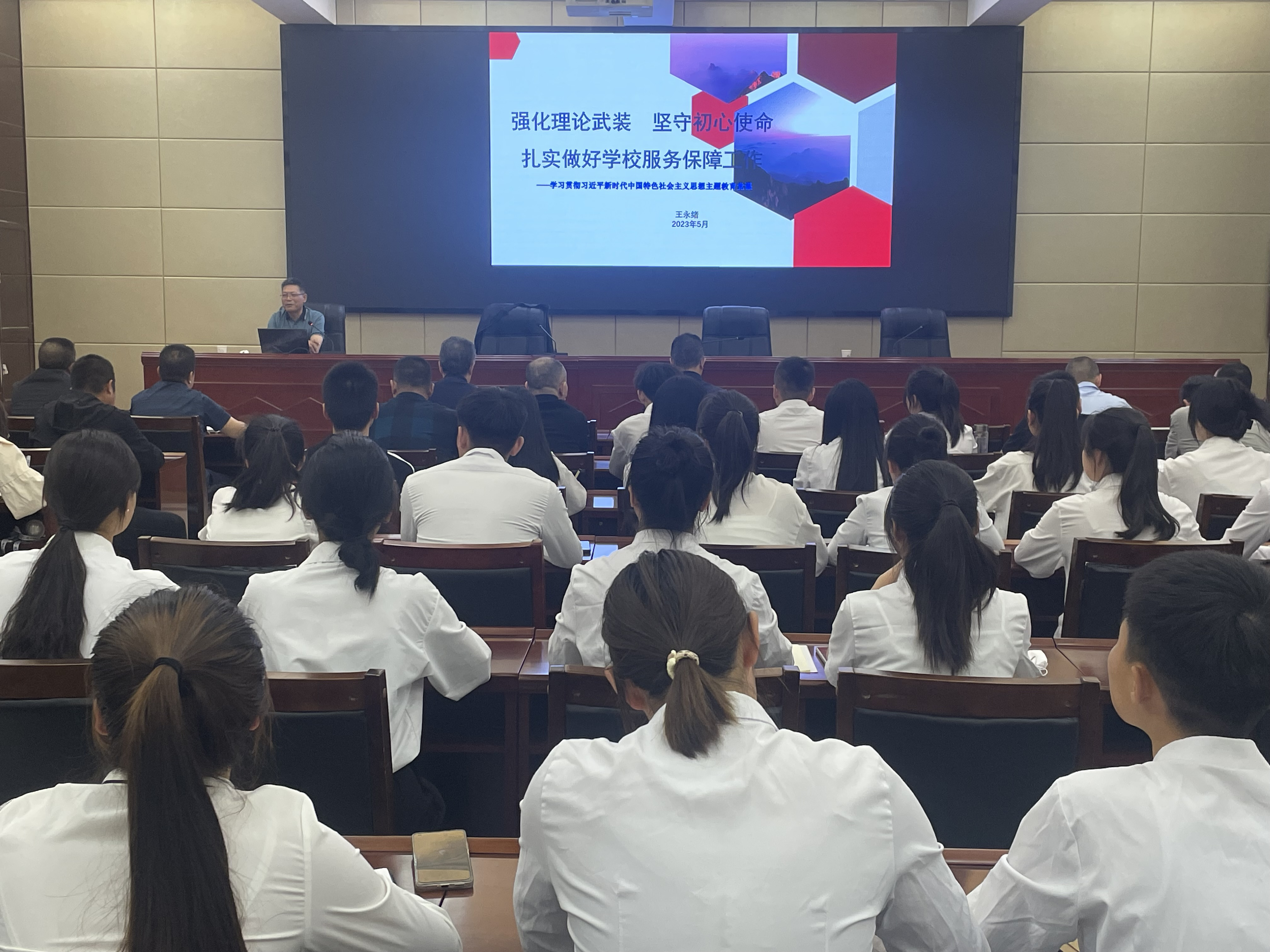 按照學(xué)校黨委關(guān)于學(xué)習(xí)貫徹習(xí)近平新時(shí)代中國(guó)特色社會(huì)主義思想主題教育的部署安排,5月31日,學(xué)校黨委委員、副校長(zhǎng)王永緒講授了題為《強(qiáng)化理論武裝? 堅(jiān)守初心使命》的專(zhuān)題黨課,后勤管理處、基建處、國(guó)有資產(chǎn)管理處、護(hù)理學(xué)院和信息技術(shù)學(xué)院全體黨員、預(yù)備黨員、發(fā)展對(duì)象等80余人聆聽(tīng)了黨課。