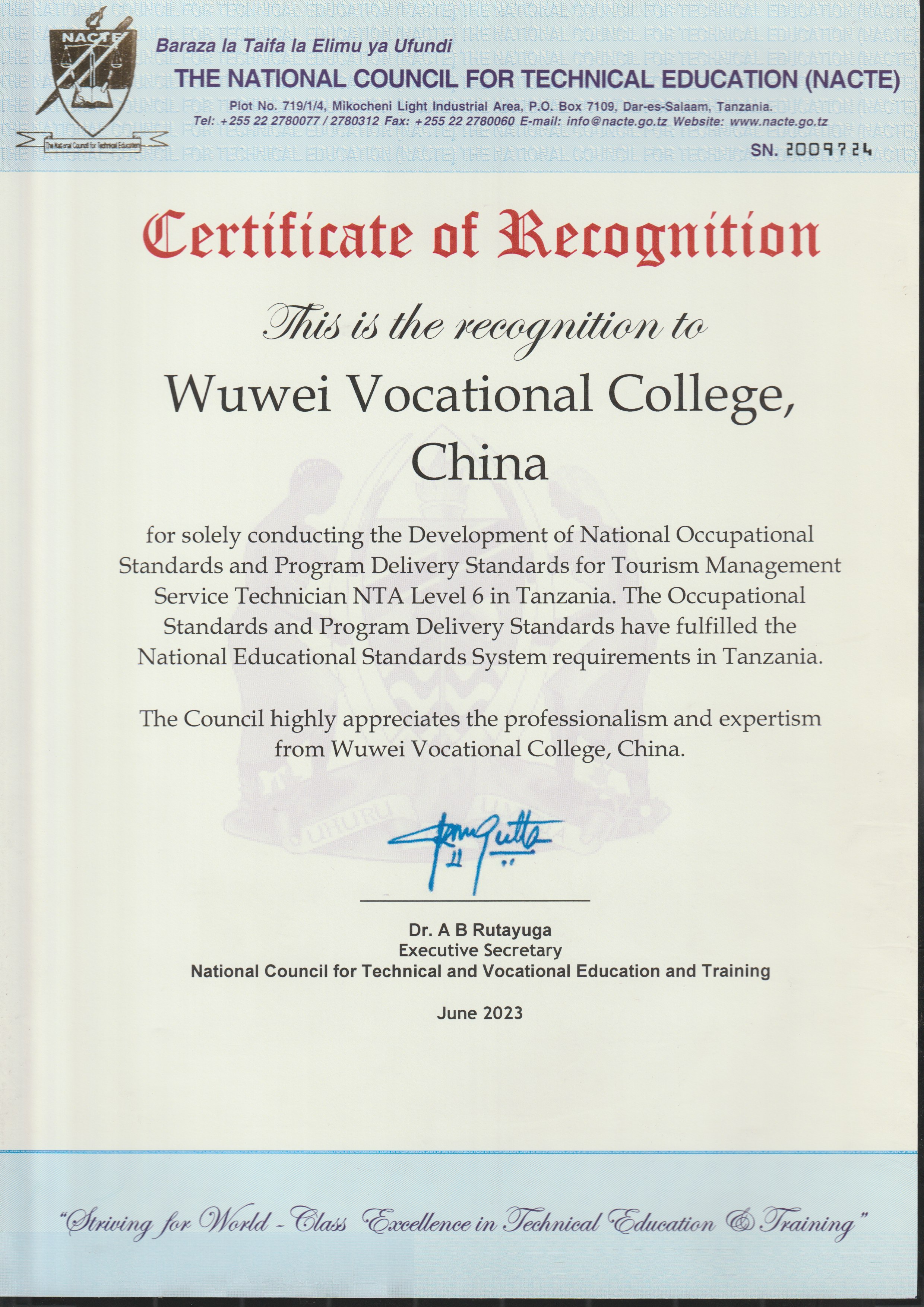 6月16日,學(xué)校獨(dú)立開發(fā)制定的旅游管理服務(wù)技術(shù)員6級職業(yè)標(biāo)準(zhǔn)和配套專業(yè)教學(xué)標(biāo)準(zhǔn)通過了坦桑尼亞國家職業(yè)教育委員會審核,獲得認(rèn)證,正式納入坦桑尼亞國家職業(yè)教育體系。旅游管理服務(wù)技術(shù)員6級職業(yè)標(biāo)準(zhǔn)和配套專業(yè)教學(xué)標(biāo)準(zhǔn)由學(xué)校經(jīng)濟(jì)管理學(xué)院旅游管理專業(yè)教師許春華、占發(fā)禹、張語悅、王美婕、閆亞旗、劉金萍六位教師共同開發(fā)制定。