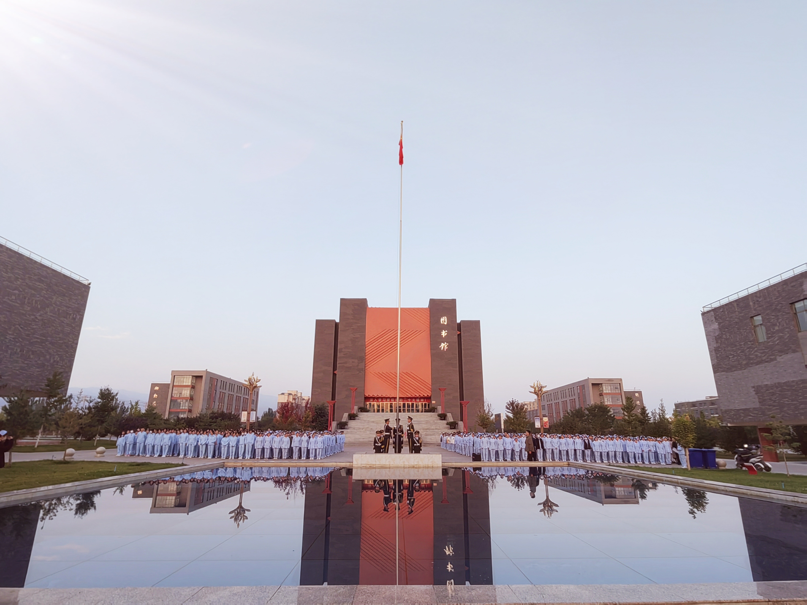 國(guó)旗護(hù)衛(wèi)隊(duì)昂首挺胸,邁著鏗鏘有力的步伐護(hù)送國(guó)旗緩緩走向旗臺(tái),全體師生肅然而立,行注目禮,伴隨著莊嚴(yán)的《中華人民共和國(guó)國(guó)歌》,五星紅旗在慷慨激昂的國(guó)歌聲中冉冉升起。