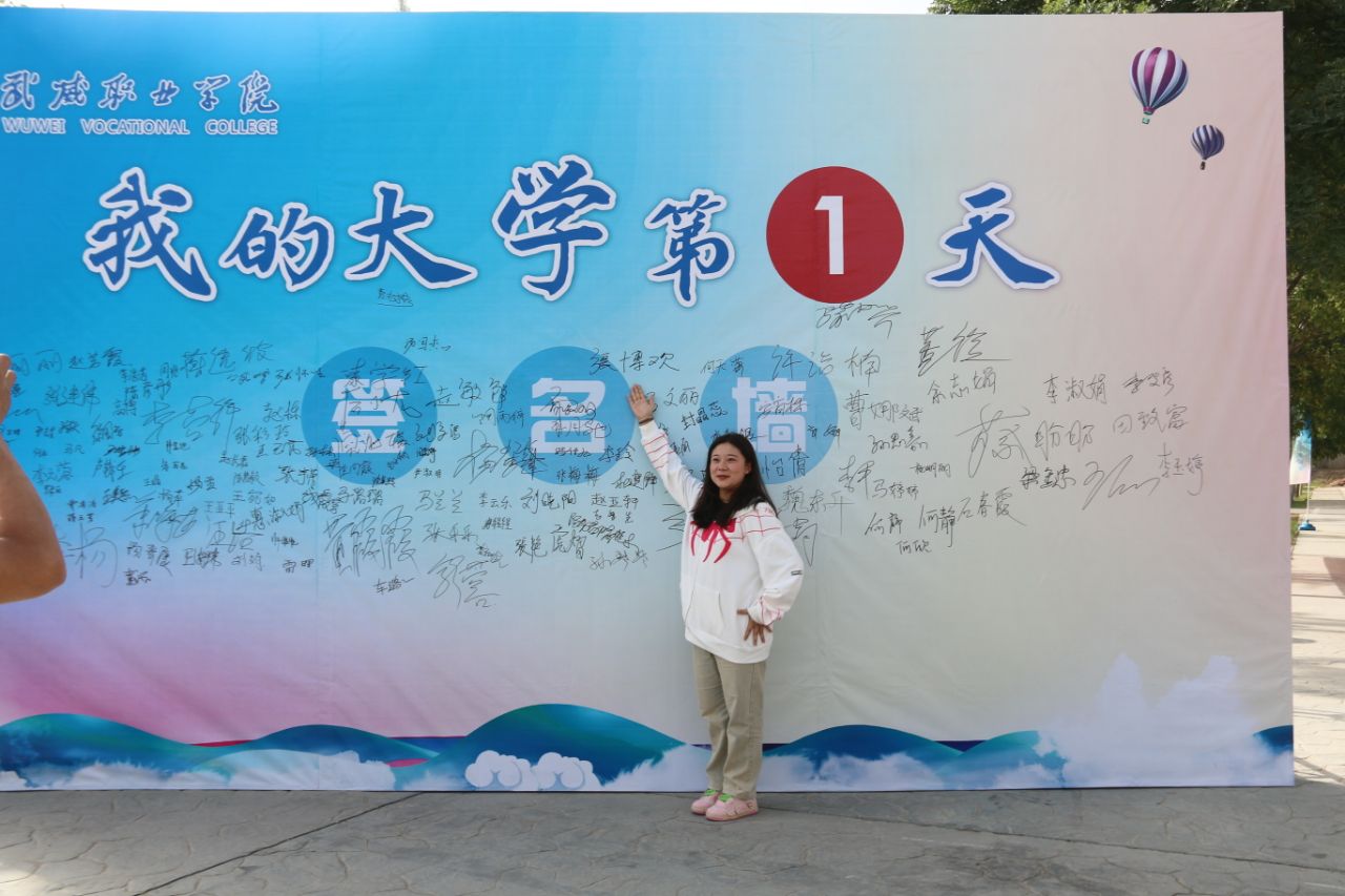新同學(xué)滿懷期盼和憧憬與校門合個影,