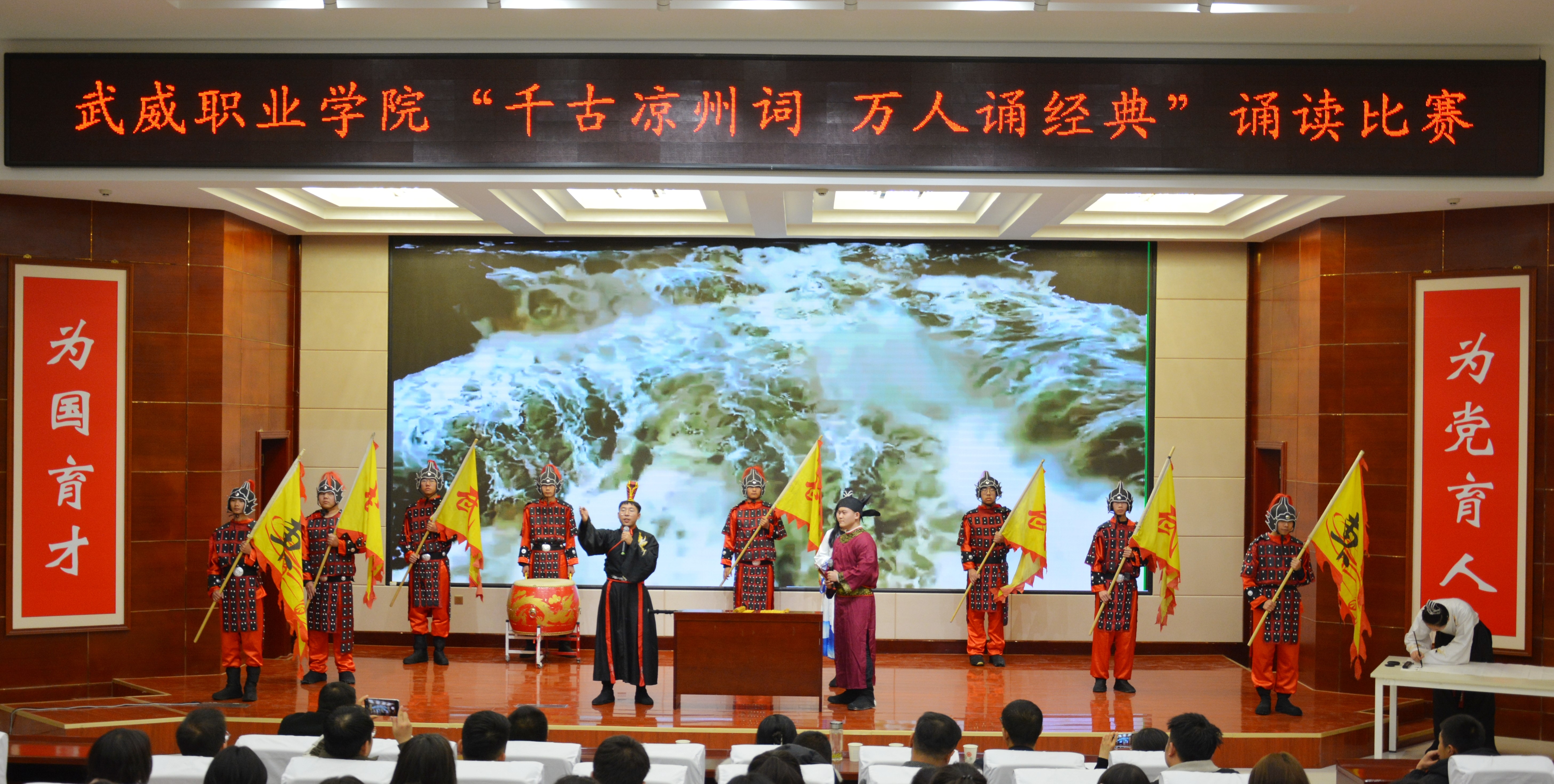 比賽現(xiàn)場精彩紛呈,現(xiàn)場氣氛異常熱烈,掌聲此起彼伏。節(jié)目以詩歌吟誦、伴舞、書法、國畫、武術(shù)、情景表演等豐富多彩的藝術(shù)形式,為現(xiàn)場觀眾打造出一場別開生面的涼州文化視聽盛宴。同學(xué)們激情洋溢,用澎湃真摯的情感演繹著經(jīng)典燦爛的磅礴詩篇,用跨越千年的對話勾勒出雄渾壯烈的漢武雄風(fēng),用鏗鏘有力的旋律編織出蕩氣回腸的時代頌歌,以青春奮斗的初心賡續(xù)著生生不息的五涼文化。