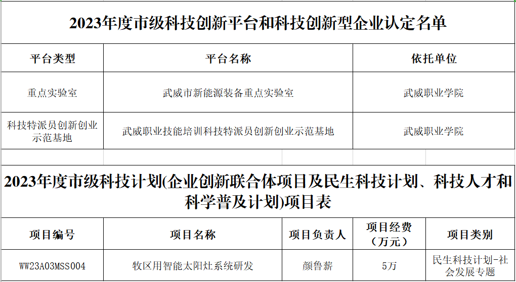 學(xué)校喜獲武威市新能源裝備重點(diǎn)實(shí)驗(yàn)室、科技特派員創(chuàng)新創(chuàng)業(yè)示范基地