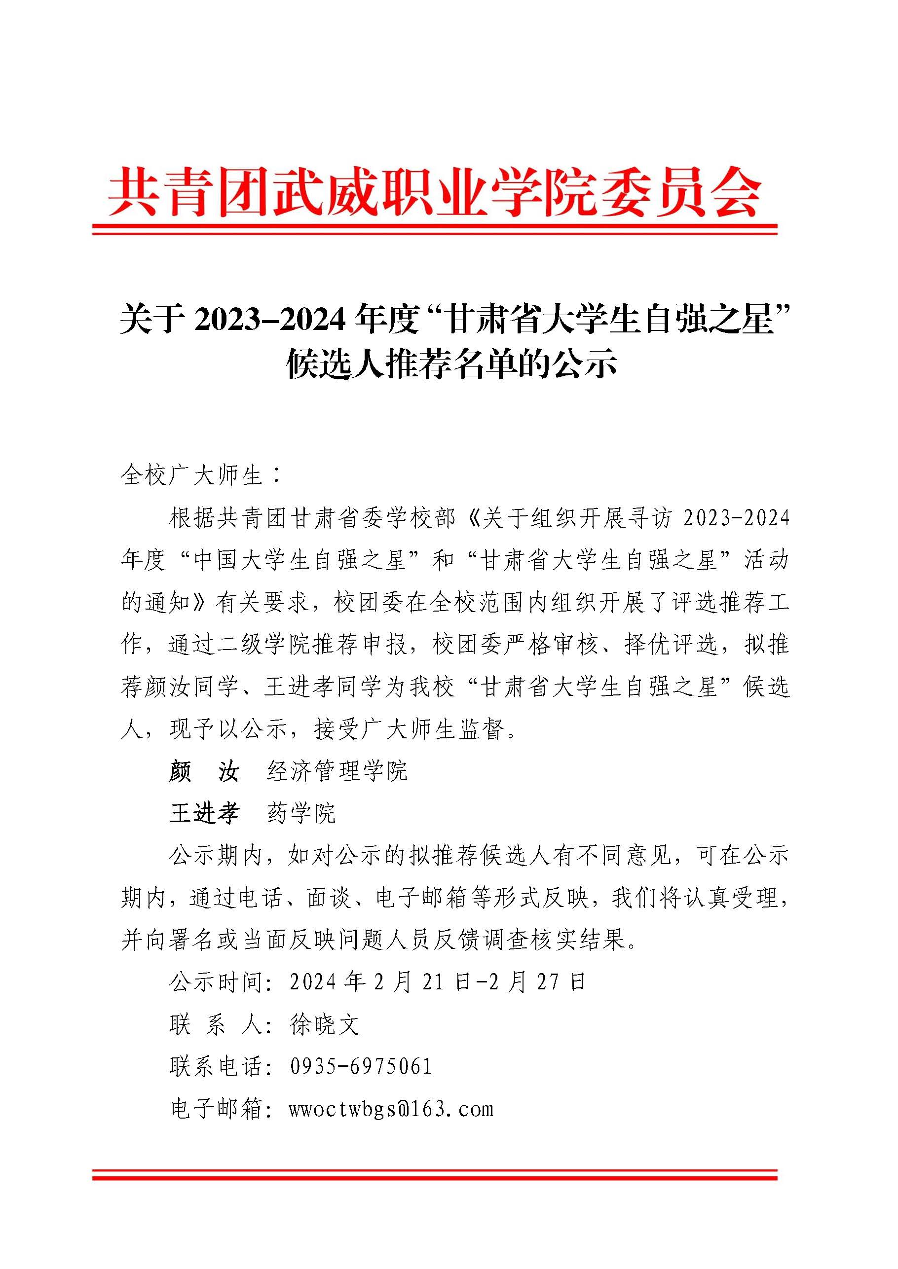 關(guān)于2023-2024年度“甘肅省大學生自強之星”候選人推薦名單的公示