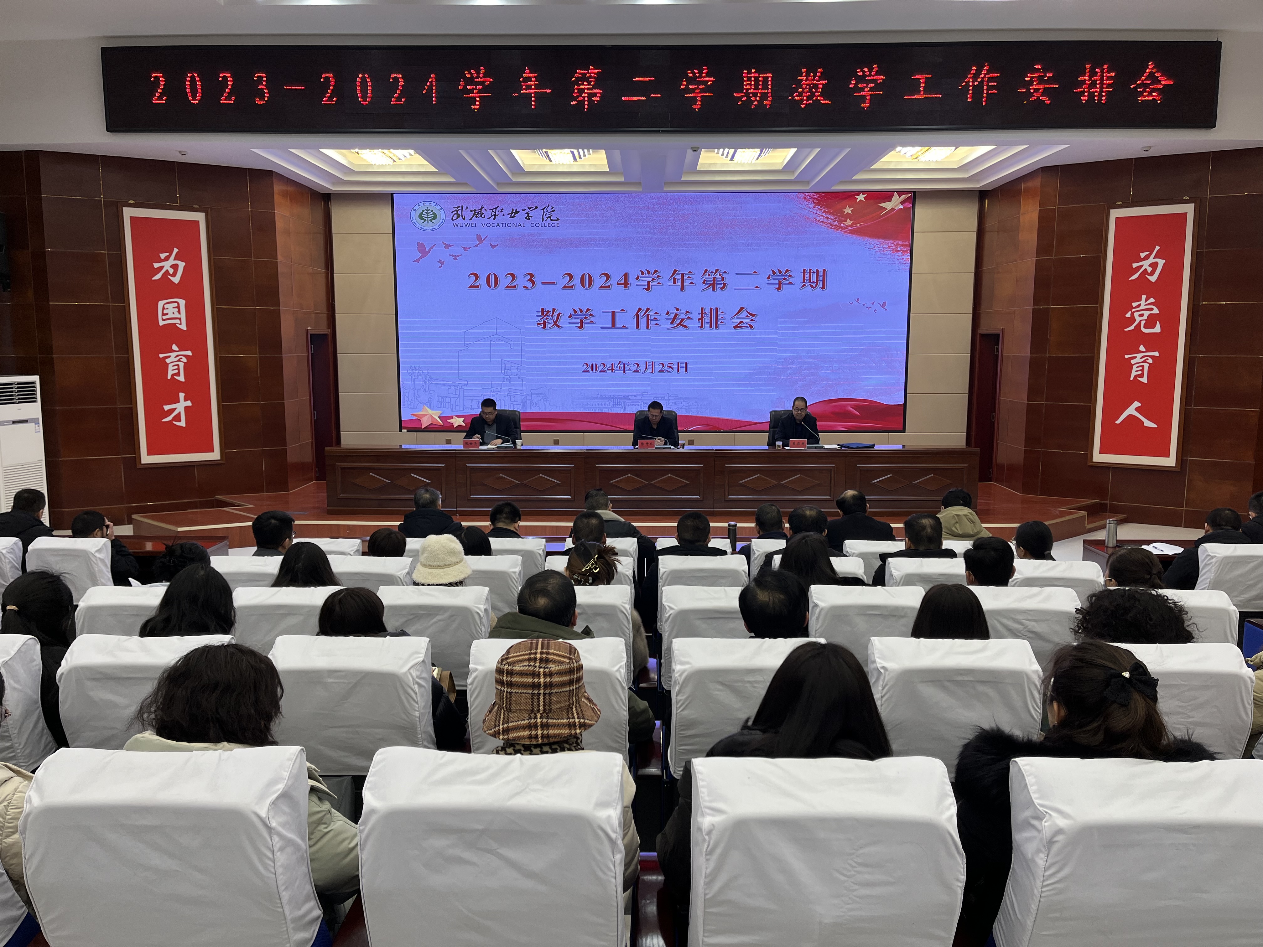 為持續(xù)推動(dòng)教學(xué)運(yùn)行與管理規(guī)范化、標(biāo)準(zhǔn)化、科學(xué)化,進(jìn)一步提升新學(xué)期教學(xué)工作成效和人才培養(yǎng)質(zhì)量,扎實(shí)推進(jìn)學(xué)校高質(zhì)量建設(shè),2月25日上午,學(xué)校在菁英廳組織召開了2023-2024學(xué)年第二學(xué)期教學(xué)工作安排會(huì)。學(xué)校校長(zhǎng)、黨委副書記張開禮、黨委副書記翟存祥、各二級(jí)學(xué)院負(fù)責(zé)人、教學(xué)秘書、教研室主任、各專業(yè)帶頭人和教務(wù)處全體工作人員參加了會(huì)議。會(huì)議由翟存祥主持。