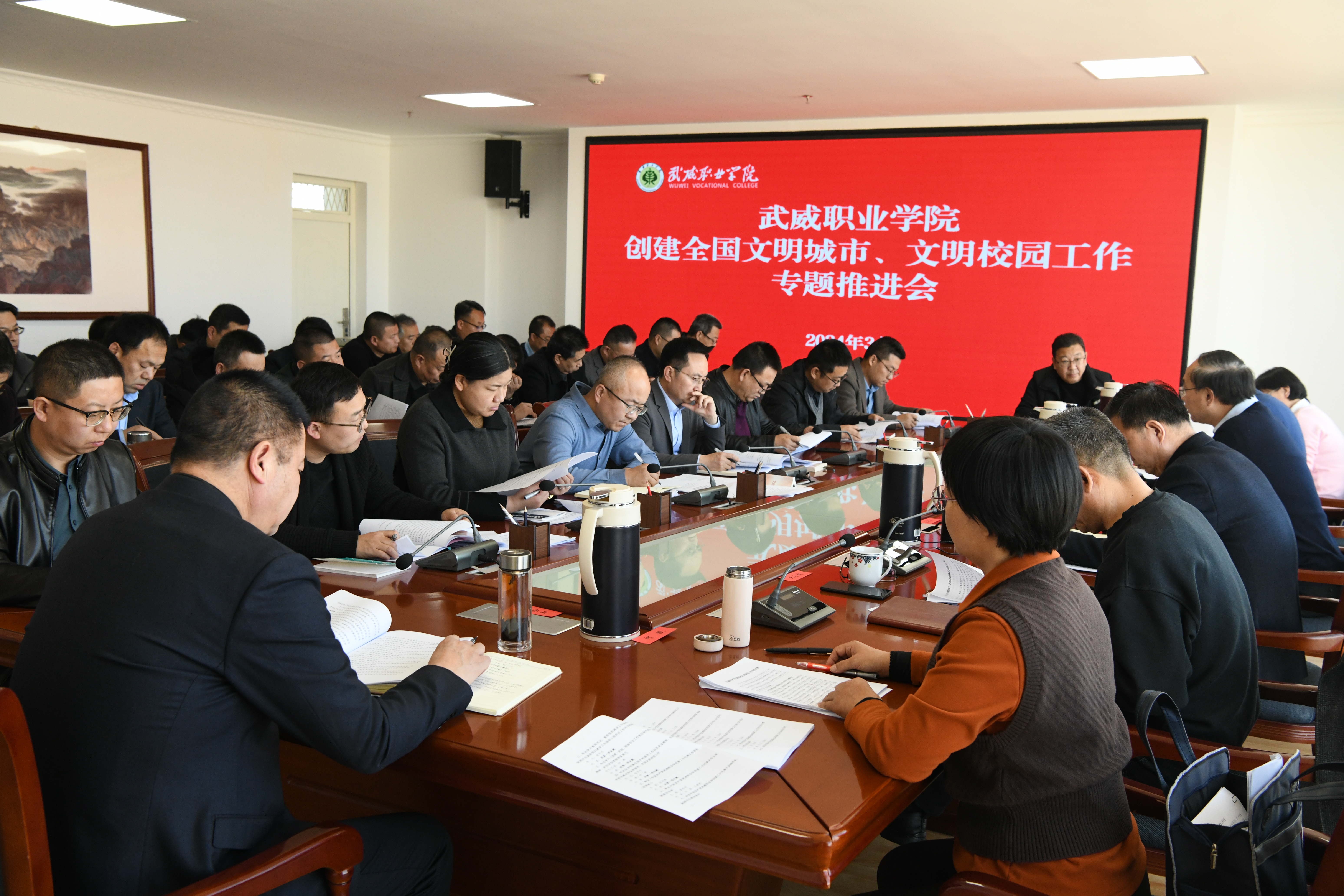 根據(jù)“武威市創(chuàng)建全國(guó)文明城市工作動(dòng)員大會(huì)”精神,3月8日下午,學(xué)校在能源科技樓811會(huì)議室召開(kāi)了2024年創(chuàng)建全國(guó)文明城市、文明校園專(zhuān)題工作推進(jìn)會(huì)。黨委書(shū)記王宏,校長(zhǎng)、副書(shū)記張開(kāi)禮,黨委副書(shū)記翟存祥,副校長(zhǎng)王永緒、田迎春、何毅,紀(jì)委書(shū)記、監(jiān)察專(zhuān)員陳曉煜,副校長(zhǎng)王守云出席會(huì)議,各黨總支、直屬黨支部書(shū)記,各部門(mén)、二級(jí)學(xué)院負(fù)責(zé)人參加會(huì)議。會(huì)議由黨委書(shū)記王宏主持并作了講話。