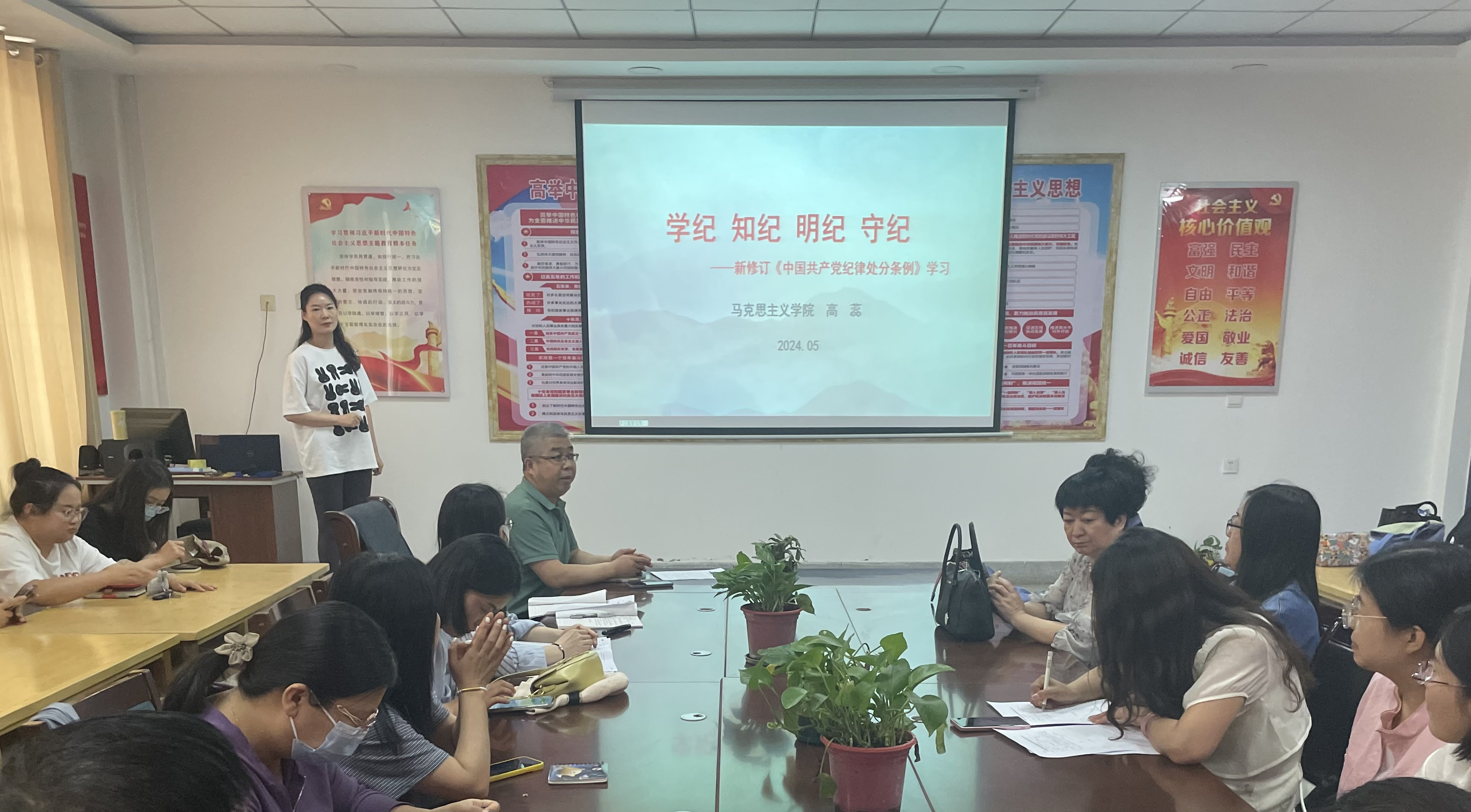 為扎實(shí)推動護(hù)理學(xué)院黨紀(jì)學(xué)習(xí)教育走深走實(shí),進(jìn)一步嚴(yán)明政治紀(jì)律和政治規(guī)矩,5月17日,學(xué)院邀請學(xué)校宣講組成員、馬克思主義學(xué)院副教授高蕊對《中國共產(chǎn)黨紀(jì)律處分條例》(以下簡稱《條例》)進(jìn)行專題宣講解讀,學(xué)院黨總支書記張建輝主持宣講活動,全體黨員干部參加。