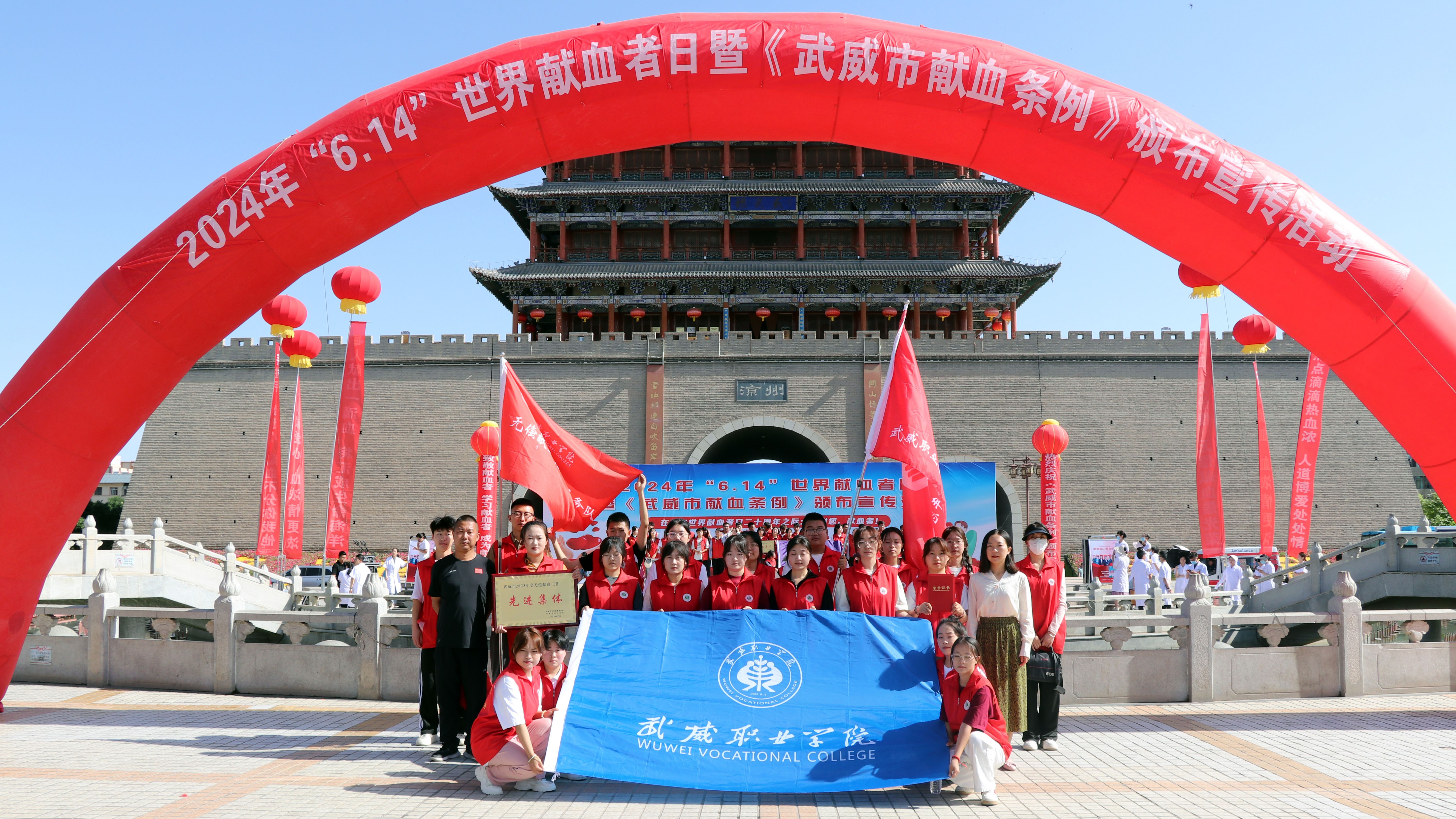 6月14日上午,我市2024年“6·14”世界獻血者日暨《武威市獻血條例》頒布宣傳活動在南城門廣場舉辦。市人大常委會副主任劉光美宣讀《條例》頒布公告,并為全市2023年度無償獻血工作先進集體、應(yīng)急獻血先進集體和先進個人頒發(fā)獎牌和榮譽證書。學(xué)校被評為武威市2023年度無償獻血工作先進集體,1名教師被評為先進個人。
