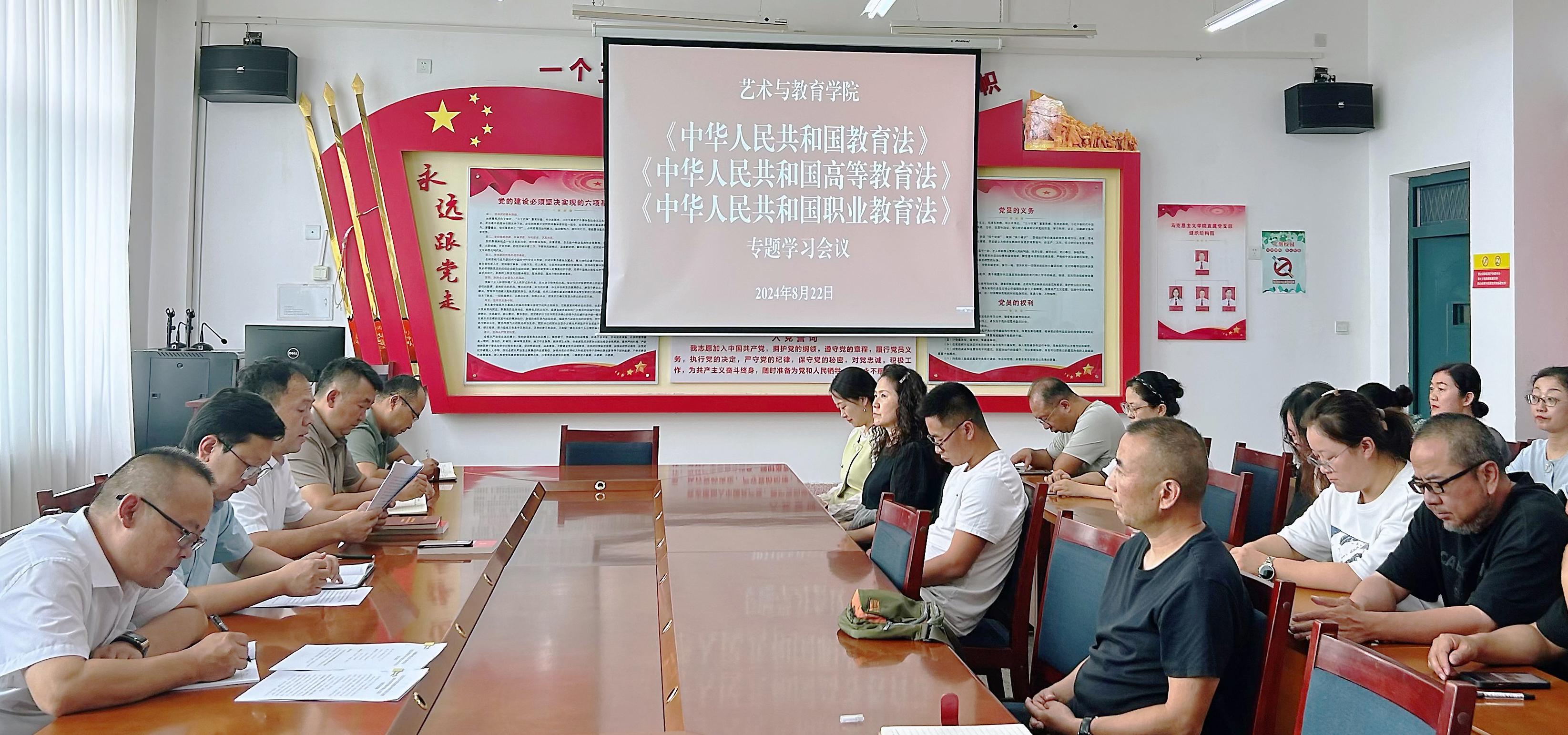 為進(jìn)一步提高教師的法律法規(guī)意識,加強教師的師德師風(fēng)建設(shè),轉(zhuǎn)變觀念、解放思想,樹立現(xiàn)代職業(yè)教育觀念,扎實推動教育教學(xué)工作高質(zhì)量發(fā)展,8月22日下午,藝術(shù)與教育學(xué)院組織全體教職工專題學(xué)習(xí)《中華人民共和國教育法》《中華人民共和國高等教育法》《中華人民共和國職業(yè)教育法》等教育相關(guān)法律法規(guī)及政策文件。會議由黨總支書記王政主持。