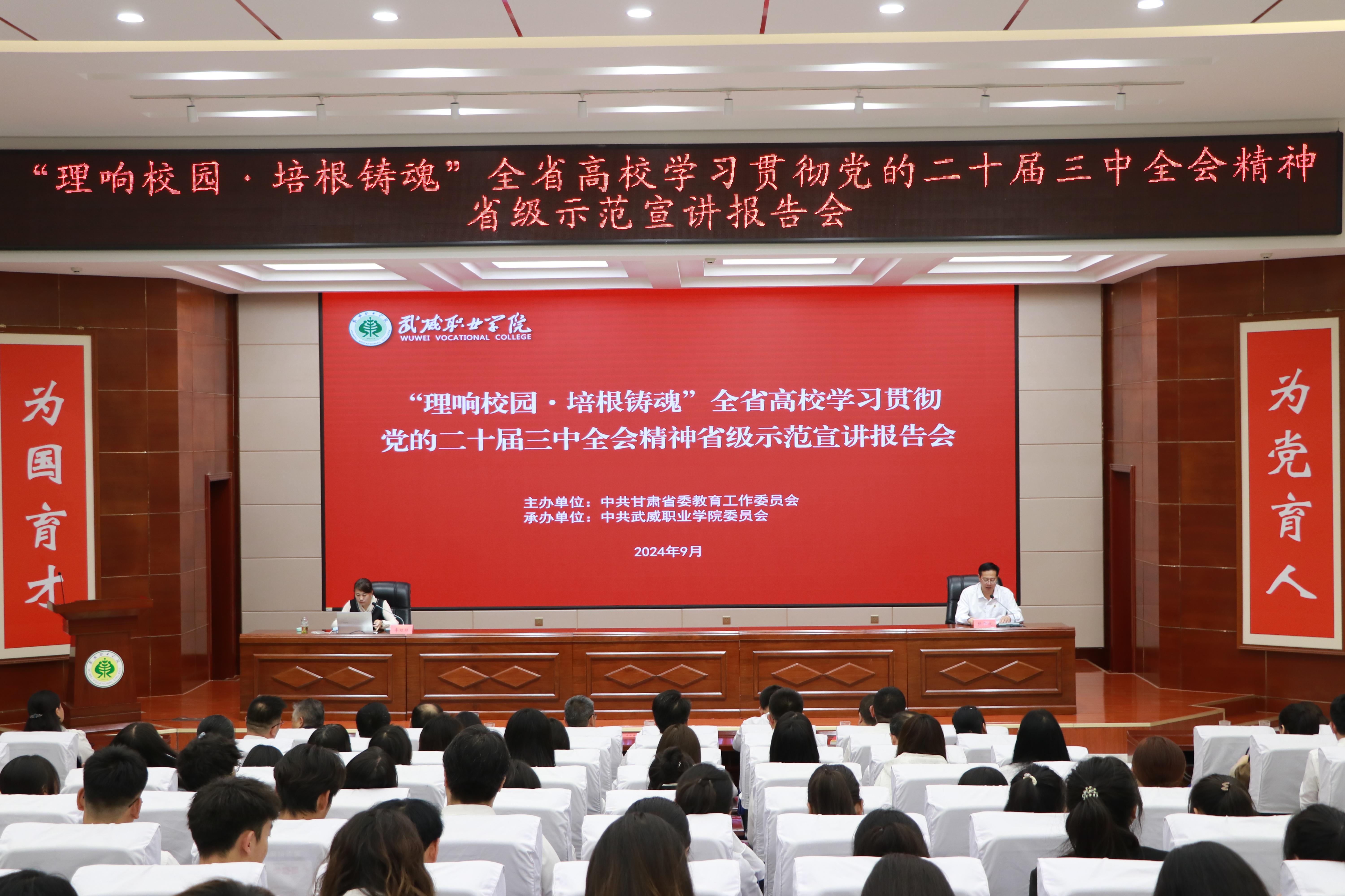 為全面深入學(xué)習(xí)宣傳貫徹黨的二十屆三中全會精神,堅(jiān)持不懈用黨的創(chuàng)新理論鑄魂育人,按照省委教育工委相關(guān)安排,9月8日下午,學(xué)校在菁英廳舉辦“理響校園·培根鑄魂”全省高校學(xué)習(xí)貫徹黨的二十屆三中全會精神省級示范宣講報告會。省委教育工委宣講團(tuán)成員、河西學(xué)院馬克思主義學(xué)院李婭婭副教授應(yīng)邀為我校師生作宣講報告。學(xué)校黨委班子成員、各部門、二級學(xué)院黨政負(fù)責(zé)人,教師代表,學(xué)生代表,共計(jì)220余人參加報告會。黨委副書記、校長張開禮主持報告會。