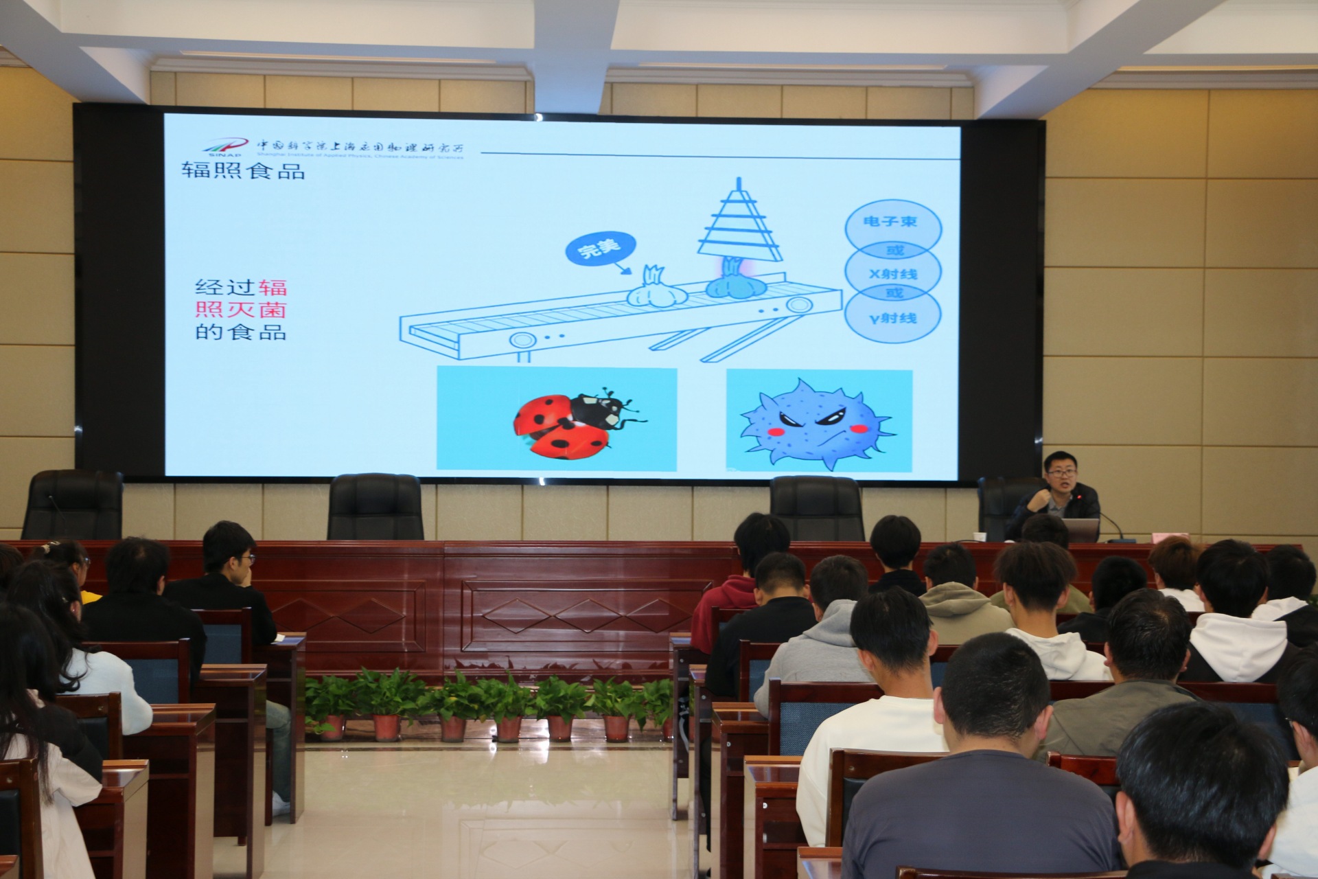 李吉豪做了題為《身入“輻”境,洞悉其益——輻照技術,點亮生活之光》的報告,從輻射技術概述科普、輻照技術在農業(yè)領域的應用、輻照技術在高分子化工領域的應用等三個方面對輻照技術的前沿應用進行了生動的講解,現(xiàn)場師生大受裨益,也讓學生對自己所學相關專業(yè)有了更加深刻的理解,同時激發(fā)了同學們對專業(yè)知識的學習熱情。