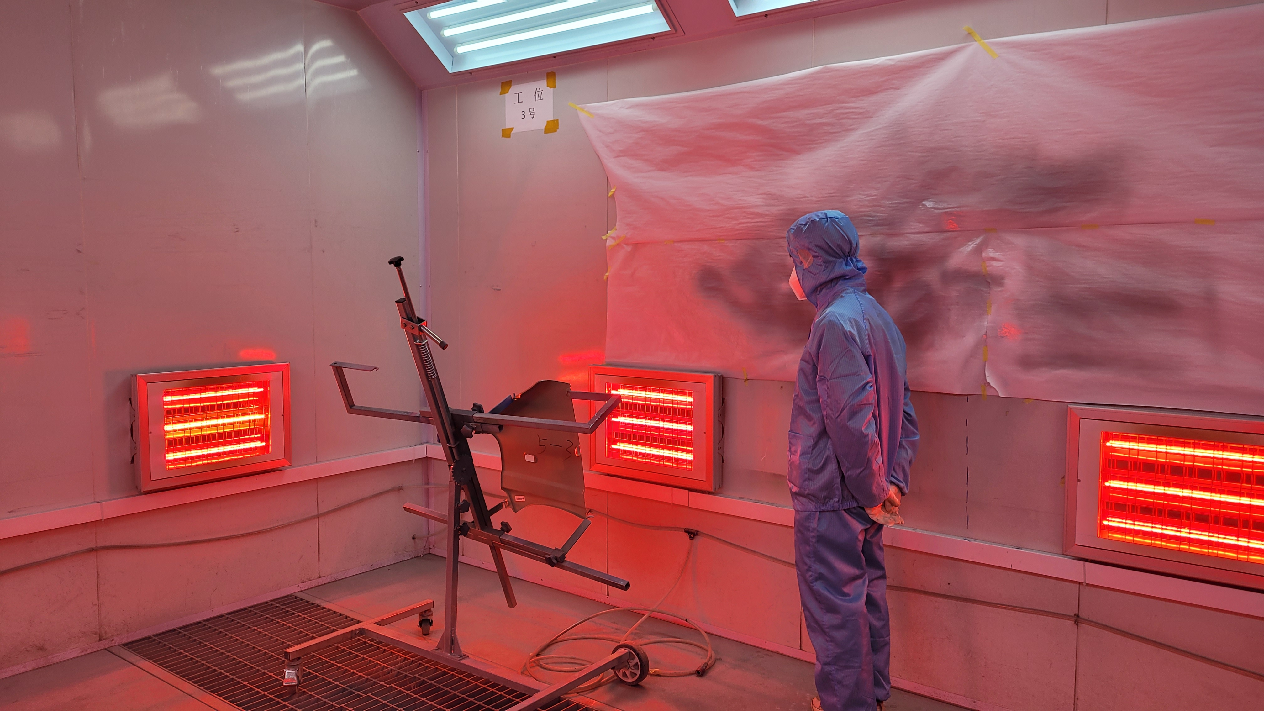 此實訓(xùn)室是兼鈑金、噴涂于一體的實訓(xùn)室,內(nèi)配有噴漆房、噴漆機(jī)、噴漆槍、普通和高性能噴漆、烘干箱、鈑金工作臺等,學(xué)生可以在真實且安全的壞境下練習(xí)和應(yīng)用鈑噴技術(shù),包括車身修補(bǔ)、涂裝物表面處理、烘干和噴漆圖層的評估等,是實訓(xùn)中心必要的設(shè)施之一。