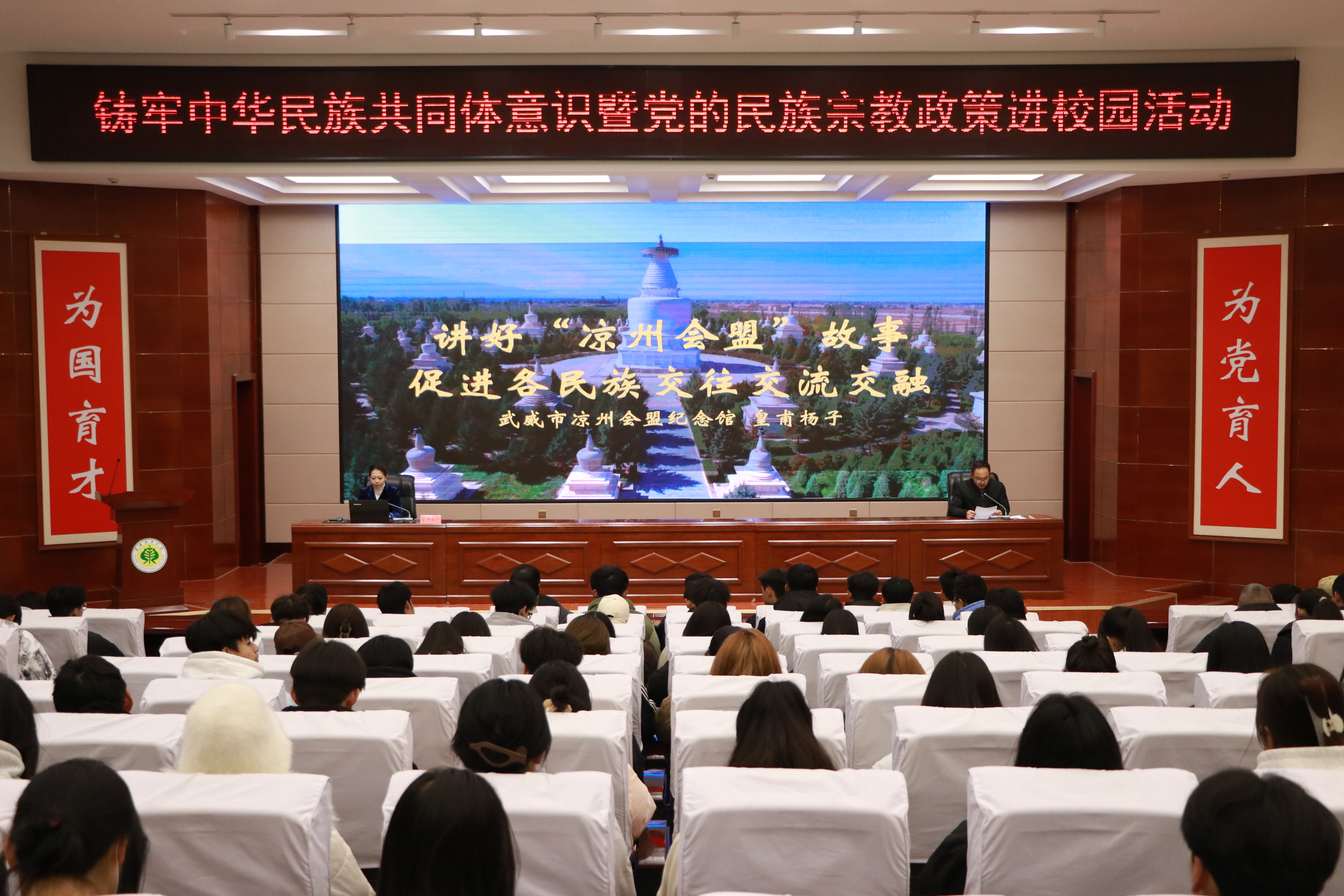 12月19日,學校聯(lián)合武威市涼州會盟紀念館,成功舉辦了鑄牢中華民族共同體意識暨民族宗教政策進校園系列活動?;顒庸参?00余名師生參觀聽講。