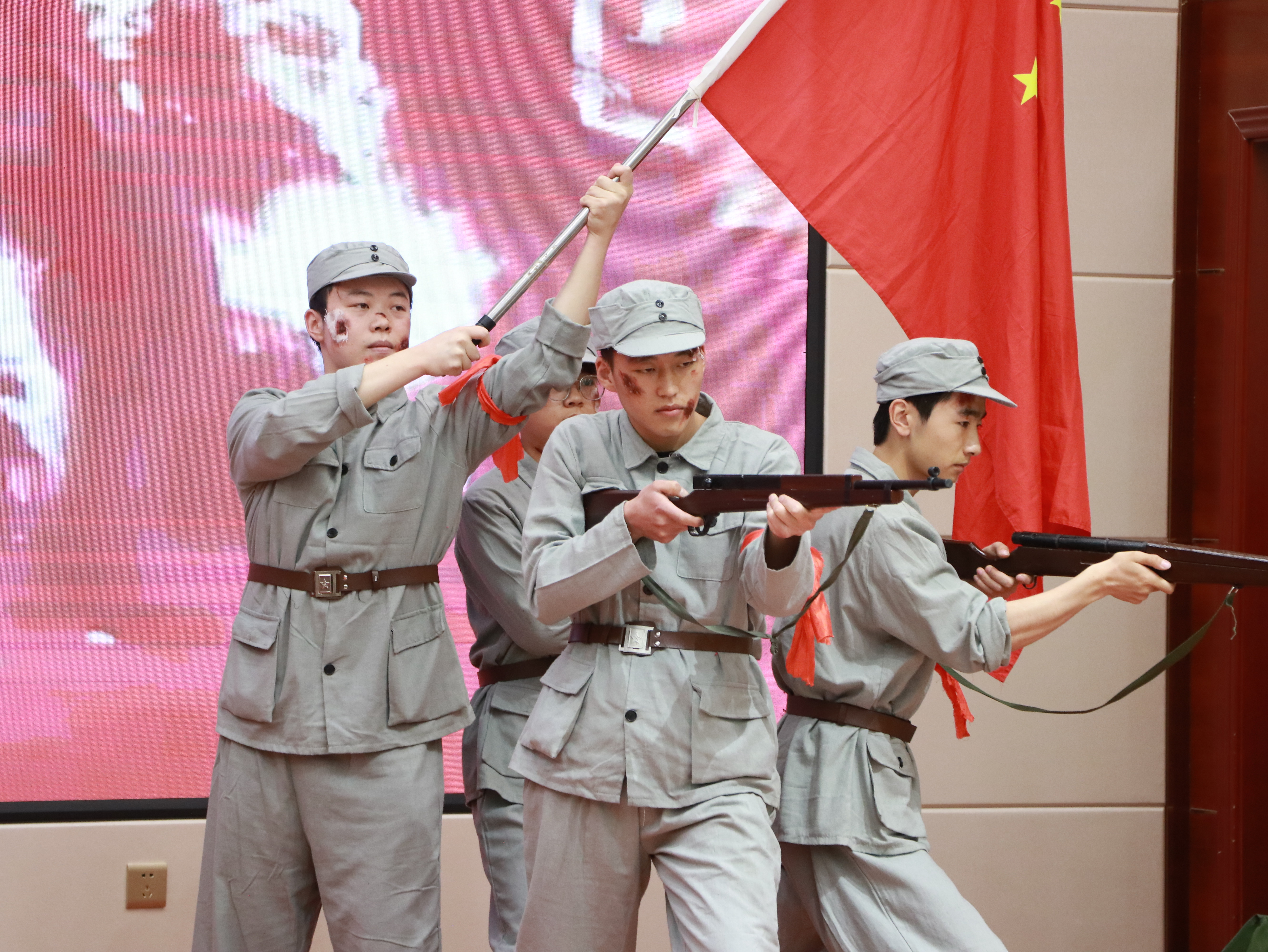 比賽現(xiàn)場(chǎng),各參賽隊(duì)伍以“誦、演、歌、頌”的復(fù)合表達(dá),帶領(lǐng)觀眾穿越歷史烽煙,重現(xiàn)那段氣壯山河的抗戰(zhàn)歲月。他們或慷慨激昂地講述革命先輩寧死不屈的壯舉,或手持泛黃家書深情誦讀,絕筆信中的母愛與家國大義在顫抖的聲線中重現(xiàn);或化身硝煙中的戰(zhàn)士,用染血繃帶與折斷鋼槍演繹出“十萬青年十萬軍”的悲壯群像。那些被歲月蝕刻的墨跡,此刻正在當(dāng)代青年的瞳孔里重新燃燒。一句句飽含深情的誦讀,一幕幕震撼人心的演繹,都傳遞著同學(xué)們對(duì)抗戰(zhàn)英烈的深切緬懷與崇高敬意?,F(xiàn)場(chǎng)掌聲如潮水般此起彼伏,經(jīng)久不息,激蕩著每一位觀眾的愛國情懷。