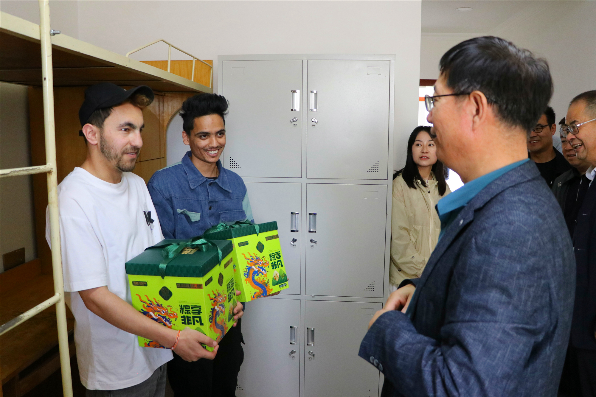 端午將至,為更好開展留學(xué)生教育管理工作,使我校來華留學(xué)生更好地認(rèn)識和體驗中國傳統(tǒng)節(jié)日文化,5月30日,學(xué)校黨委副書記、副校長張開禮,黨委副書記翟存祥,黨委委員、副校長王守云一行與國際合作交流處全體工作人員走進留學(xué)生公寓,給留學(xué)生們送去節(jié)日的關(guān)懷和溫暖。
