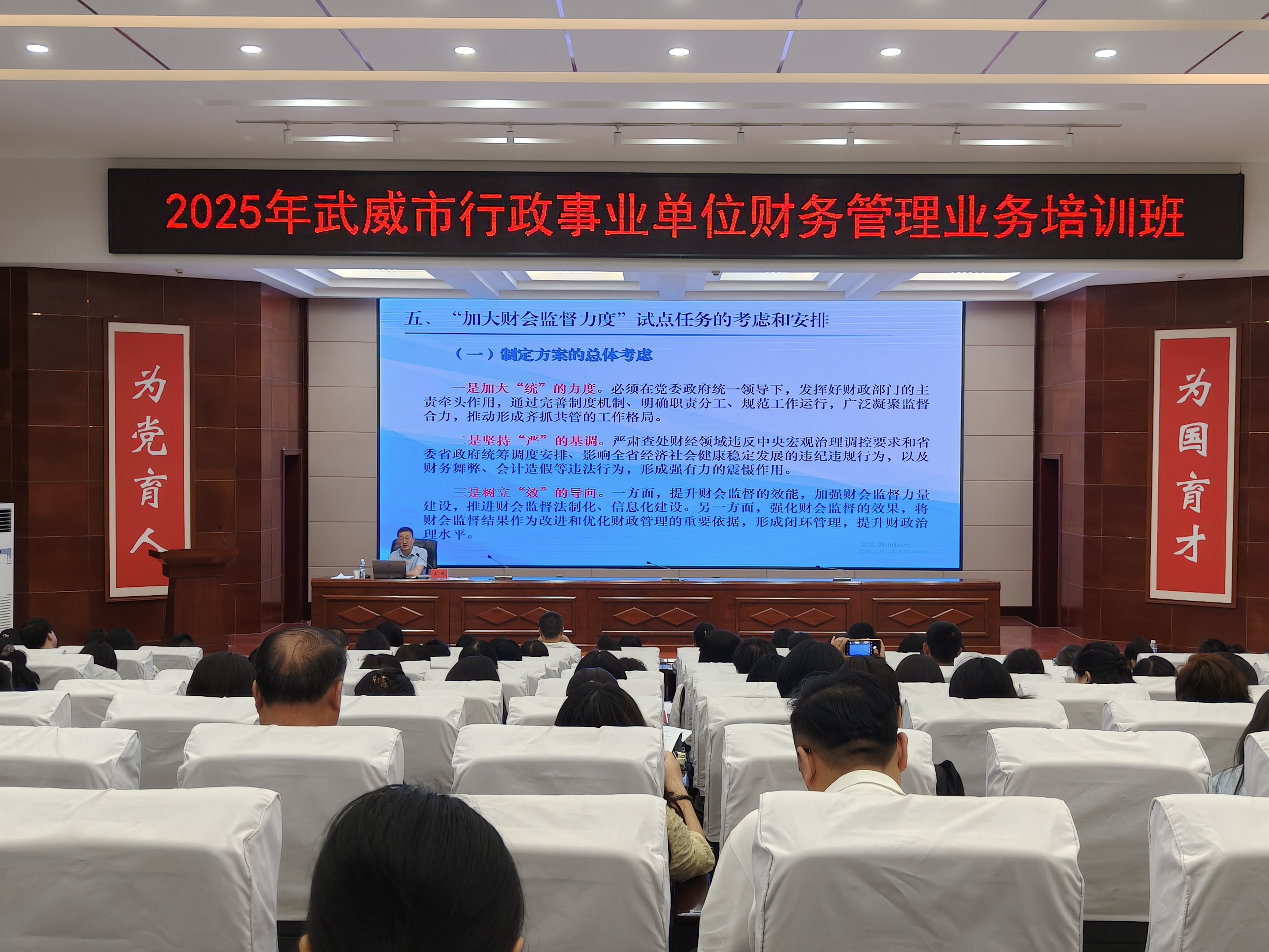 為深入貫徹實(shí)施新《會(huì)計(jì)法》,進(jìn)一步做好2025年全市行政事業(yè)單位財(cái)會(huì)人員素質(zhì)提升和崗位能力培訓(xùn)工作,根據(jù)市財(cái)政局局黨組年初工作安排,6月11日-12日,由武威市財(cái)政局主辦,學(xué)校承辦的全市行政事業(yè)單位財(cái)務(wù)管理業(yè)務(wù)培訓(xùn)班在菁英廳順利舉行。全市行政事業(yè)單位財(cái)務(wù)業(yè)務(wù)骨干及業(yè)務(wù)人員共180余人參加了培訓(xùn)。