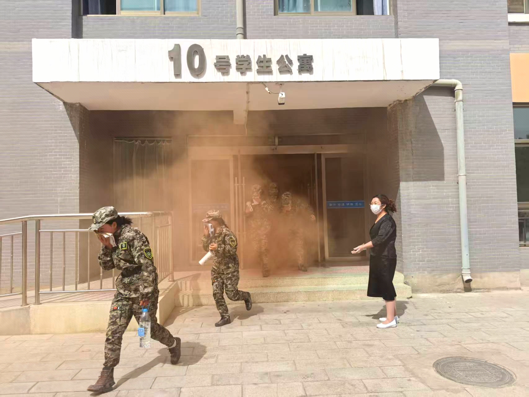 14時30分,疏散演練正式開始。隨著火災(zāi)警報響起,安全保衛(wèi)工作人員點燃煙餅,在學生公寓樓模擬火災(zāi)現(xiàn)場,冒出滾滾濃煙,公寓管理人員迅速組織學生有序疏散。在輔導(dǎo)員、班主任的引導(dǎo)下,同學們按照疏散要領(lǐng)和疏散路線,快速、有序地撤離至體育場。