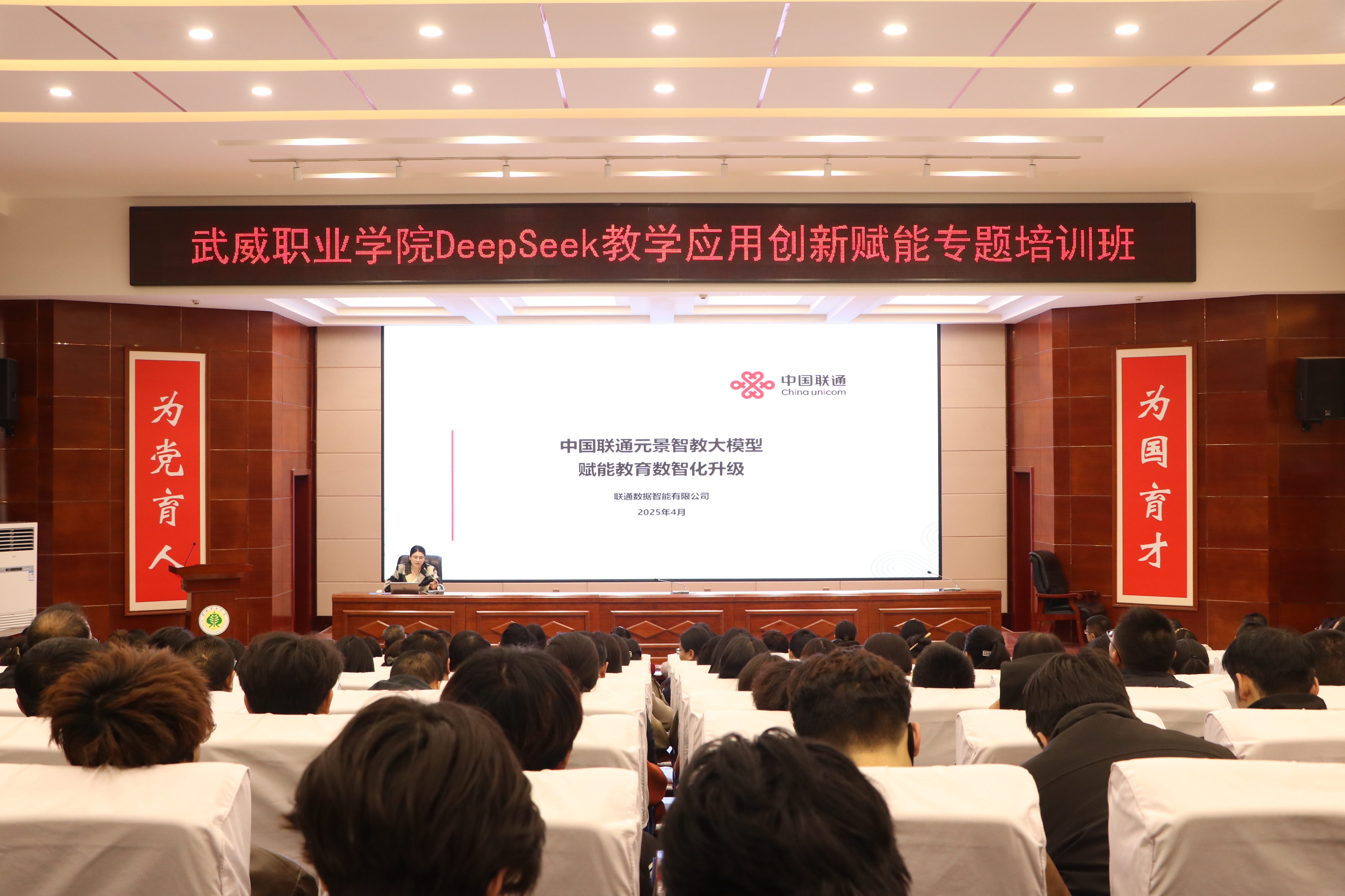 為深入探討DeepSeek技術(shù)的應(yīng)用,助力學(xué)校師生運(yùn)用AI工具進(jìn)行教學(xué)實(shí)踐、智慧課程建設(shè)與科學(xué)研究工作,為教學(xué)改革與教學(xué)創(chuàng)新實(shí)踐筑基賦能。4月3日,學(xué)校邀請聯(lián)通數(shù)據(jù)智能有限公司教育行業(yè)解決方案專家包紅梅和華為技術(shù)有限公司智算產(chǎn)業(yè)AI架構(gòu)師王鑫,舉辦了“DeepSeek教學(xué)應(yīng)用創(chuàng)新賦能”專題講座。講座由網(wǎng)絡(luò)安全與信息技術(shù)中心負(fù)責(zé)人史子新主持,學(xué)校各部門、二級學(xué)院教師代表,信息技術(shù)學(xué)院學(xué)生代表共計(jì)220人參加。