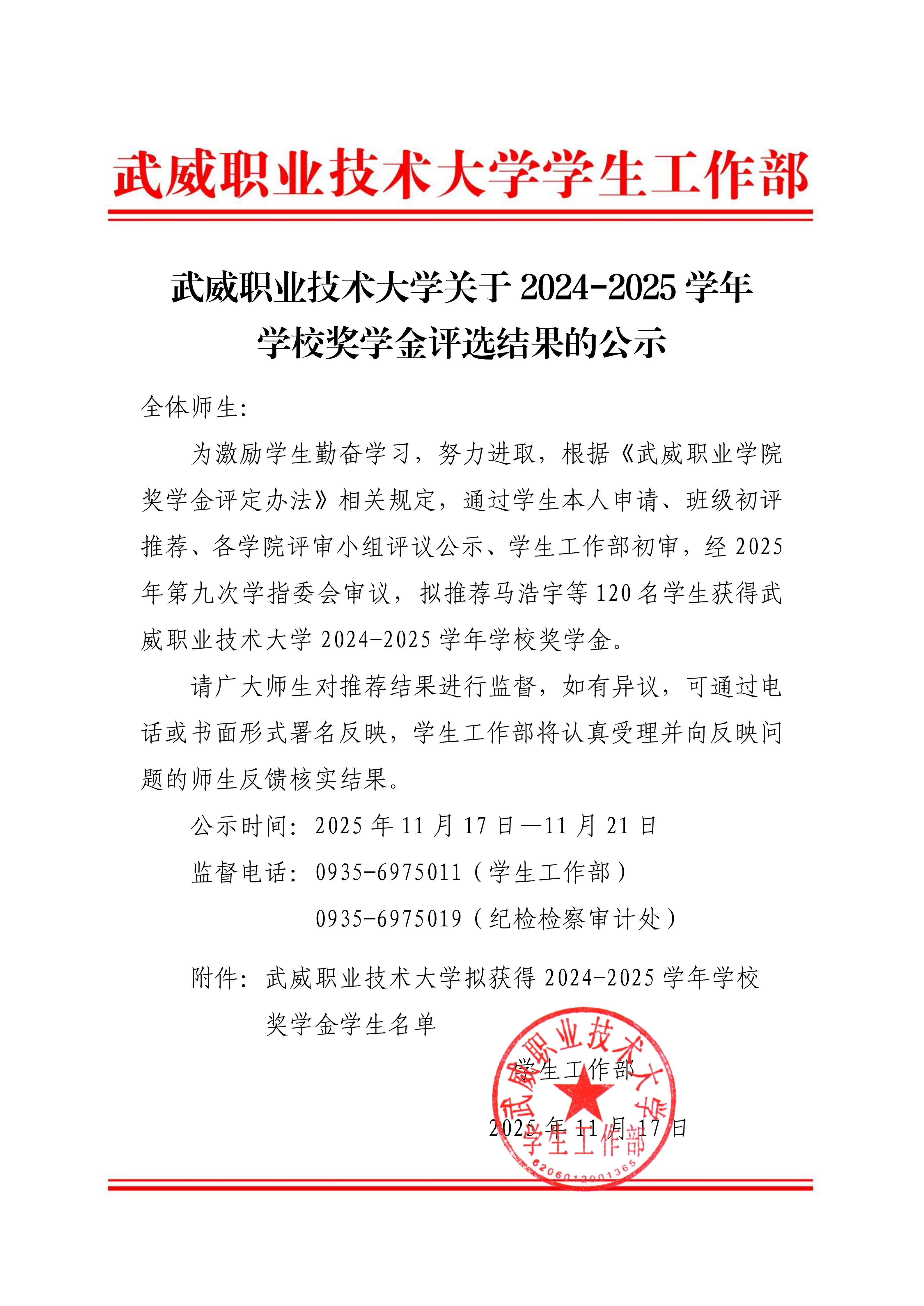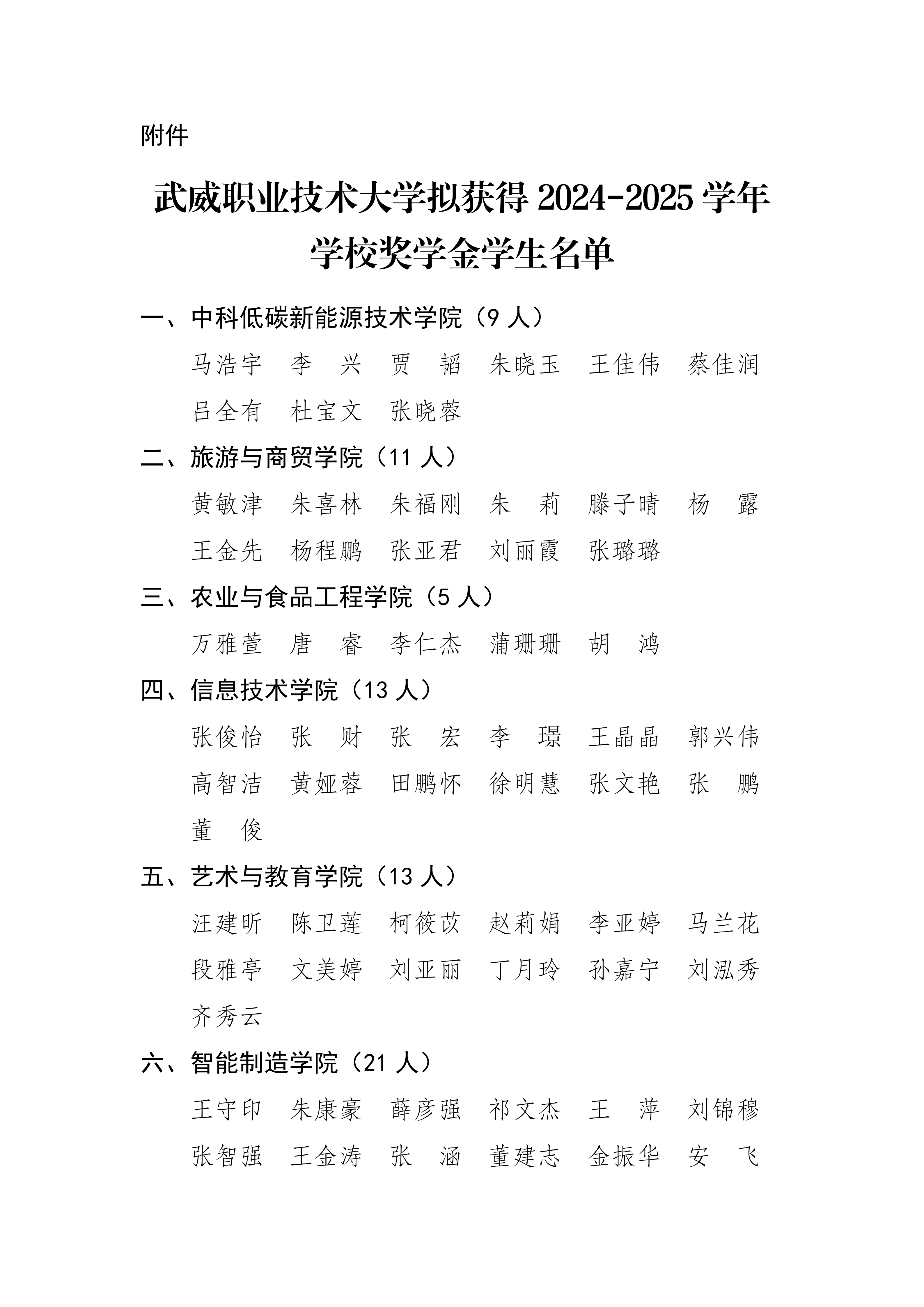 武威職業(yè)技術大學關于2024-2025學年學校獎學金評選結果的公示