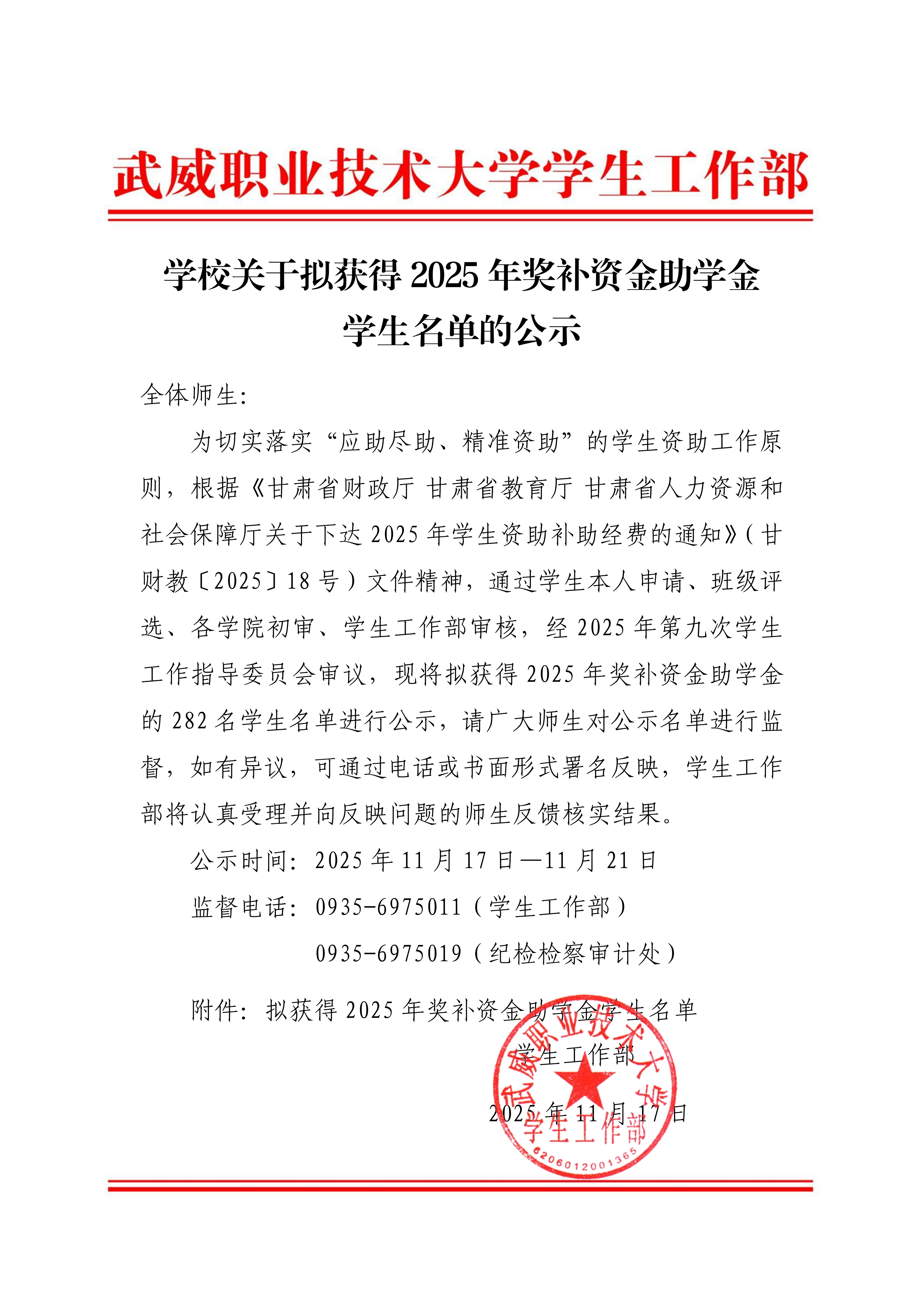 武威職業(yè)技術(shù)大學(xué)關(guān)于馮嘉俊等21名學(xué)生2025-2026學(xué)年學(xué)費減免的公示