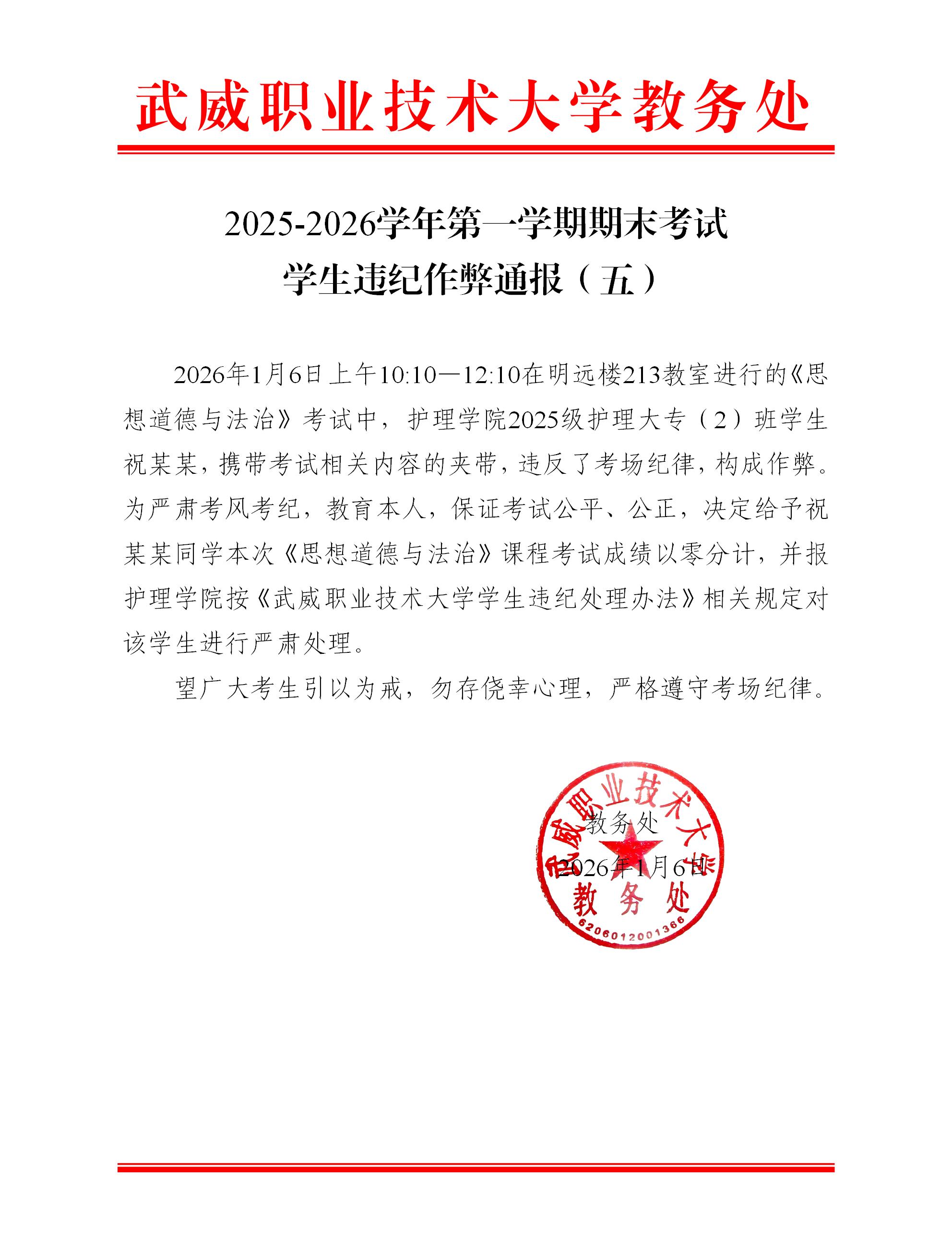 2025-2026學(xué)年第一學(xué)期期末考試學(xué)生違紀(jì)作弊通報(bào)(五)