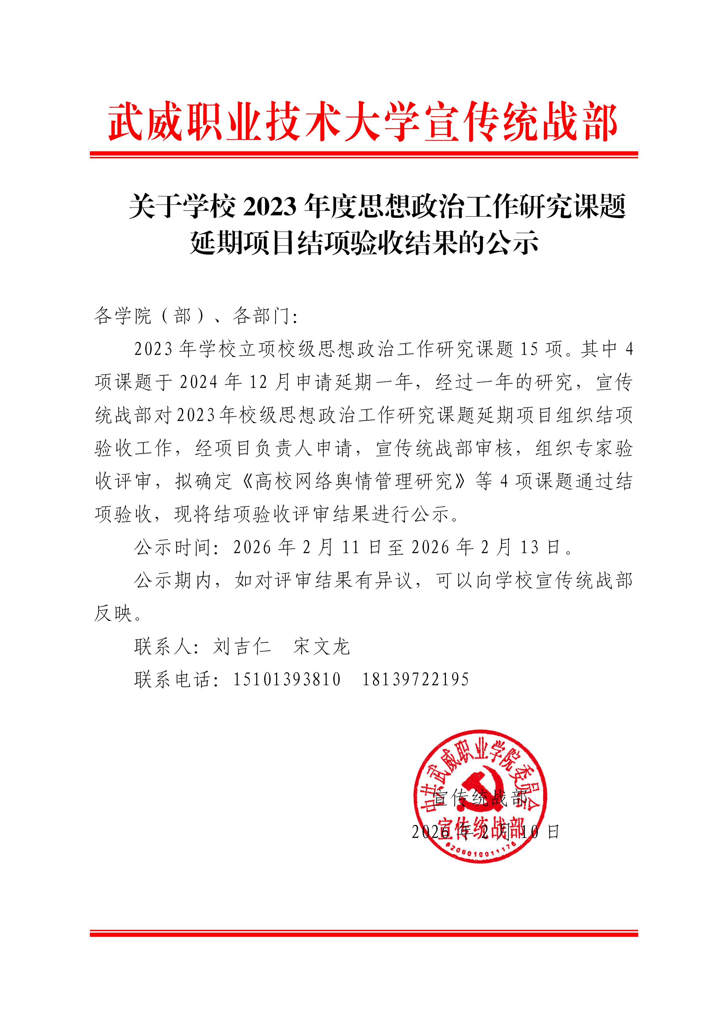 關(guān)于學(xué)校2023年度思想政治工作研究課題延期項(xiàng)目結(jié)項(xiàng)驗(yàn)收結(jié)果的公示