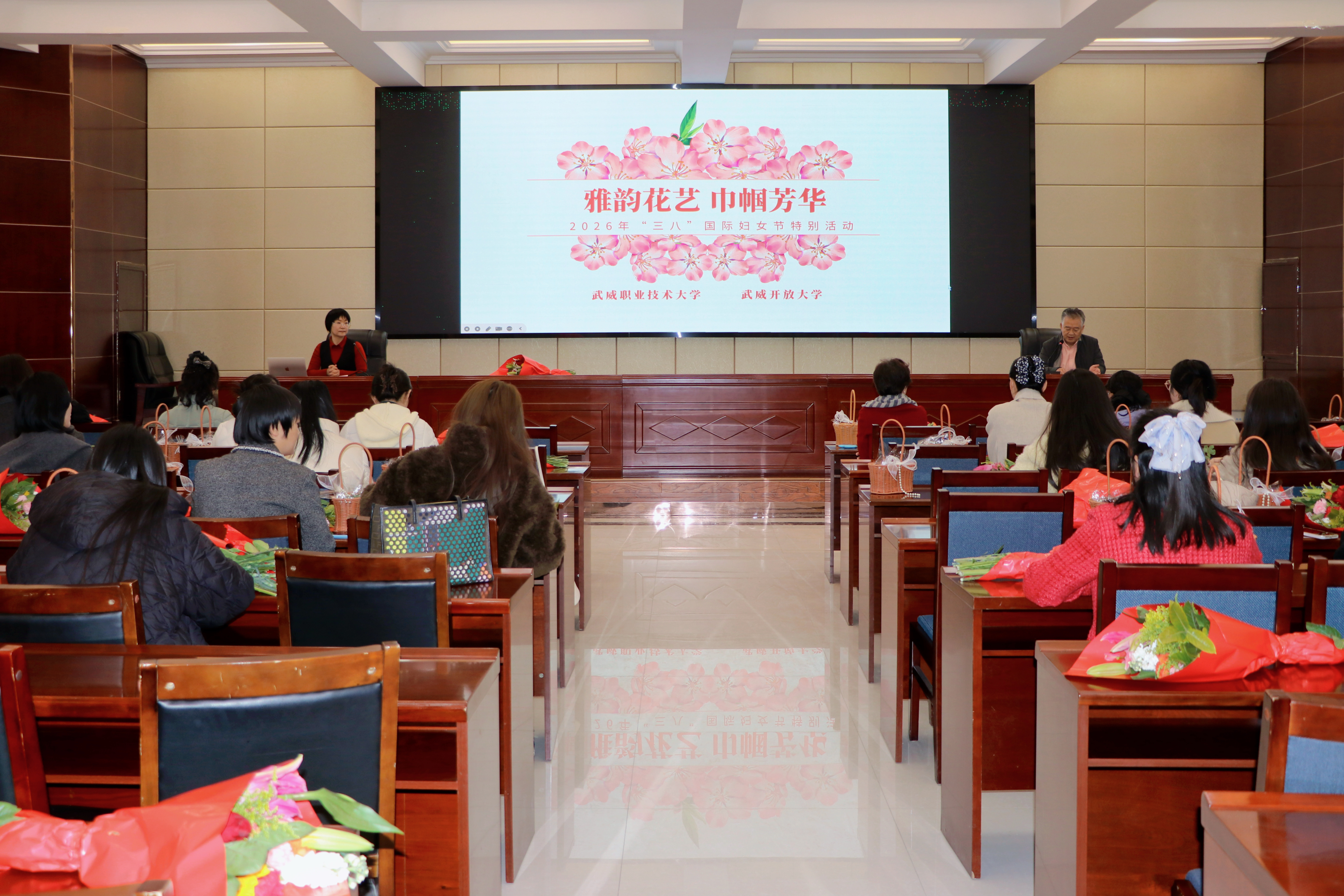 為慶祝第116個(gè)“三八”國際勞動(dòng)?jì)D女節(jié),3月6日,學(xué)校工會(huì)聯(lián)合武威開放大學(xué),在行樹樓北側(cè)報(bào)告廳組織開展了以“雅韻花藝?巾幗芳華”為主題的插花活動(dòng),130余名女教職工歡聚一堂、共赴花約。黨委委員、副校長何毅出席活動(dòng)并致辭。
