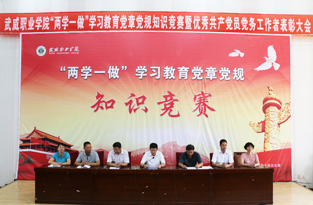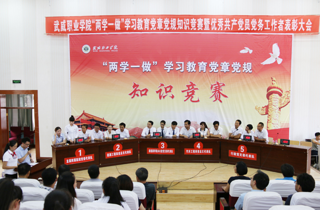 7月6日下午,武威職業(yè)學(xué)院“兩學(xué)一做”學(xué)習(xí)教育黨章黨規(guī)知識競賽暨優(yōu)秀共產(chǎn)黨員、優(yōu)秀黨務(wù)工作者表彰大會在尚德樓正德廳召開。黨委書記張國民,黨委副書記趙明,紀(jì)委書記張富國,副院長翟存祥、王永緒、潘玉華、田迎春出席會議。直屬附屬醫(yī)院黨委主要負(fù)責(zé)同志、各黨總支(直屬黨支部)書記,各部門負(fù)責(zé)人,受表彰的優(yōu)秀共產(chǎn)黨員、優(yōu)秀黨務(wù)工作者以及參加競賽的代表隊成員共270人參加了知識競賽活動和表彰大會。表彰大會由黨委副書記趙明主持。