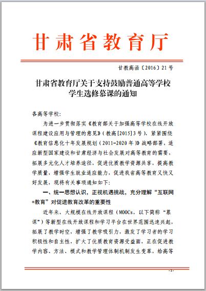甘肅省教育廳關(guān)于支持鼓勵普通高等學校學生選修慕課的通知