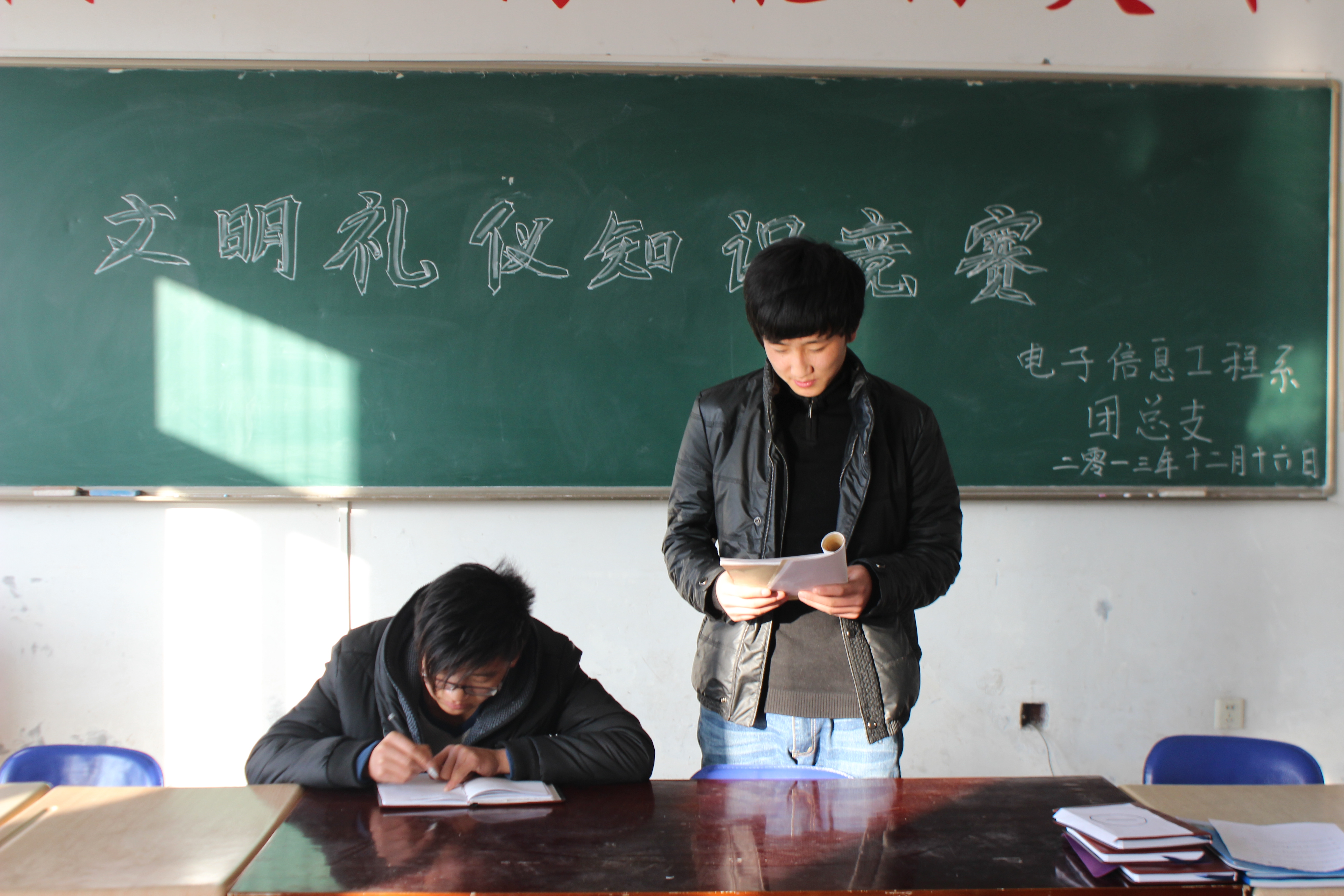 2013年12月16日晚,電子信息工程系團總支在1-304教室組織開展電信系文明禮儀知識競賽;來自電信系2012、2013級8個大專班的24名同學參加此次活動。