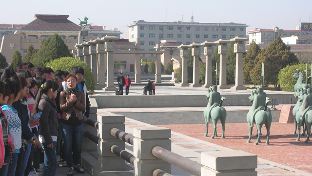 同學們在講解員的帶領下,首先從漢風格大門"中華第一門"開始、參觀了天下第一馬"馬踏飛燕"、凝聚漢文化精粹的巨型浮雕、牌樓、圖騰柱以及堪稱"世界之最"的整體放大6倍的99件銅車馬儀仗俑隊列,最后參觀了雷臺漢文化陳列館.