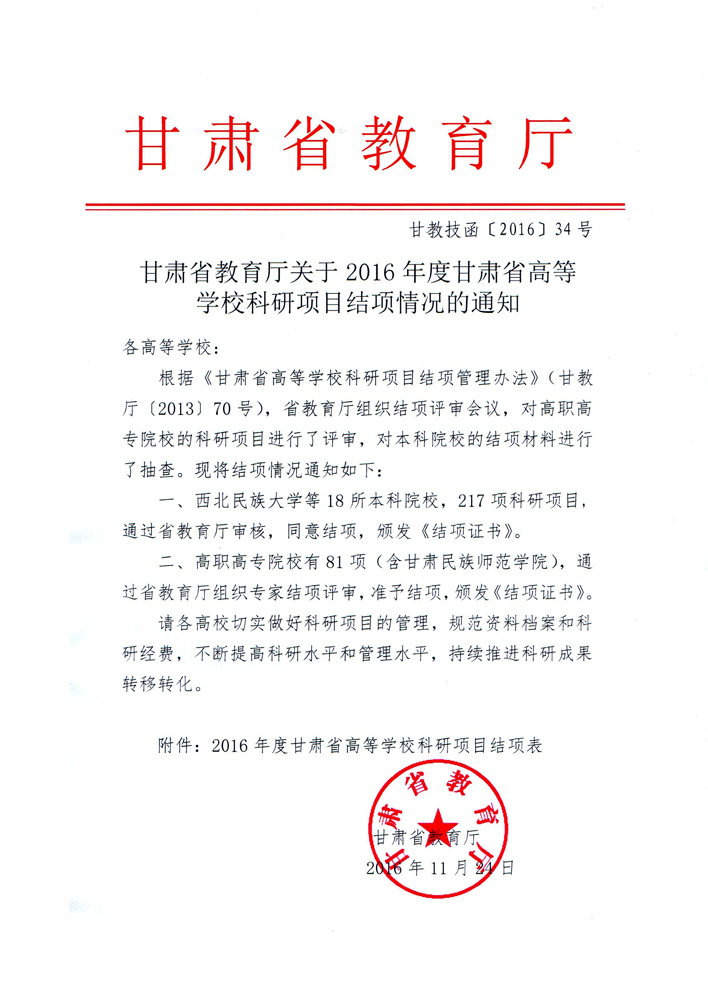 甘肅省教育廳關(guān)于2016年度甘肅省高等學(xué)校科研項(xiàng)目結(jié)項(xiàng)情況的通知