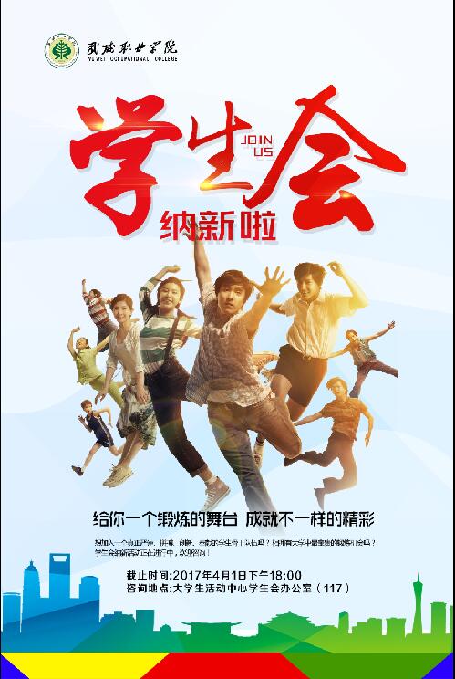 武威職業(yè)學(xué)院學(xué)生會(huì)是在學(xué)院黨委領(lǐng)導(dǎo)下,院團(tuán)委指導(dǎo)下,學(xué)生自發(fā)組織的群眾性學(xué)生組織。為進(jìn)一步加強(qiáng)學(xué)院學(xué)生會(huì)隊(duì)伍建設(shè),為廣大同學(xué)提供一個(gè)自我鍛煉的平臺(tái),院團(tuán)委研究決定面向2016級(jí)全體同學(xué)公開招聘學(xué)院學(xué)生會(huì)干部?,F(xiàn)將具體事宜通知如下: