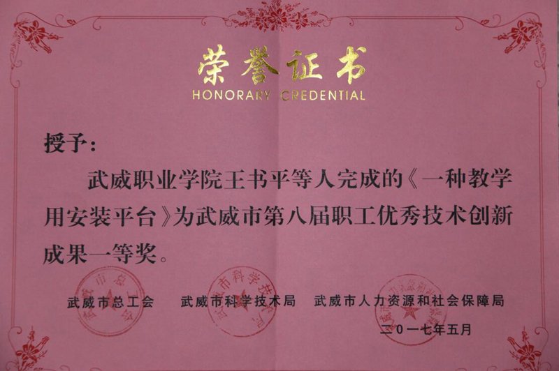 為貫徹落實武威市委、市政府關于《武威市十萬職工職業(yè)技能素質提升活動工作方案(2016-2020年)》(武政辦發(fā)〔201672號)文件精神,推動我市“雙創(chuàng)”工作的深入開展,激發(fā)我市廣大企事業(yè)職工提升技能和開拓創(chuàng)新的熱情。近日,由市總工會、市人社局、市科技局等單位聯(lián)合舉辦了“武威市第八屆職工技術創(chuàng)新成果評選活動”。本屆職工技術創(chuàng)新成果評選共征集創(chuàng)新成果87項,其中:學院推薦了十項研究課題、專利技術項目,王書平團隊《一種教學用安裝平臺》項目成果榮獲一等獎,申賓德團隊《簡易焊工考試用帶坡口鋼板火焰切割下料機的研究與應用》,王勝團隊《“胰美舒”治療2型糖尿病周圍神經(jīng)病變(氣陰兩虛兼瘀證)的臨床觀察》項目成果榮獲三等獎。