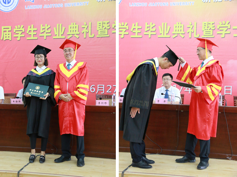 蘭交大教務(wù)處副處長(zhǎng)王海涌宣讀了關(guān)于授予學(xué)士學(xué)位的決定;學(xué)生處處長(zhǎng)貢力宣讀了關(guān)于表彰2016屆優(yōu)秀畢業(yè)生的決定;校黨委副書(shū)記、常務(wù)副校長(zhǎng)李引珍為2017屆畢業(yè)生代表正冠撥穗并頒發(fā)學(xué)位證書(shū);各位領(lǐng)導(dǎo)為畢業(yè)生頒發(fā)了畢業(yè)證書(shū)和優(yōu)秀畢業(yè)生榮譽(yù)證書(shū)。