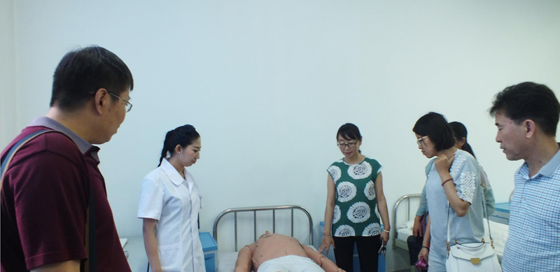 趙鳳舞一行參觀了護理系的生命科技館、機能實訓(xùn)室、基護實訓(xùn)室、內(nèi)外科實訓(xùn)室等醫(yī)學(xué)類實訓(xùn)室,詳細了解了實驗設(shè)備的運行情況和實驗實訓(xùn)課程的教學(xué)管理模式。韓曉萍向來賓們介紹了我院護理專業(yè)的發(fā)展歷史、課程建設(shè)、師資力量、實習就業(yè)及籌建實驗實訓(xùn)室取得的成果。