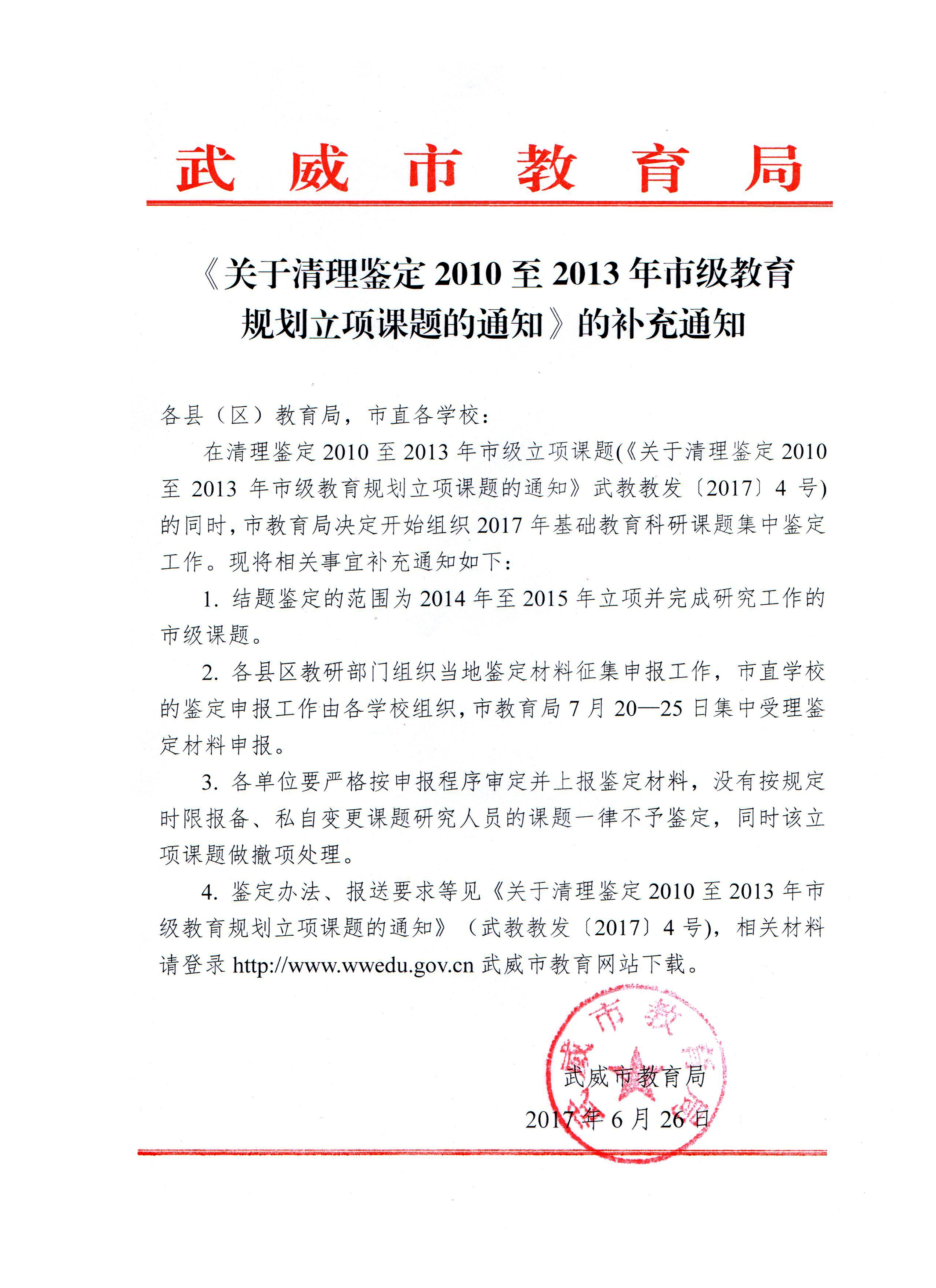 轉(zhuǎn)發(fā)武威市教育局《關(guān)于清理鑒定2010至2013年市級規(guī)劃立項課題的通知》的補充通知