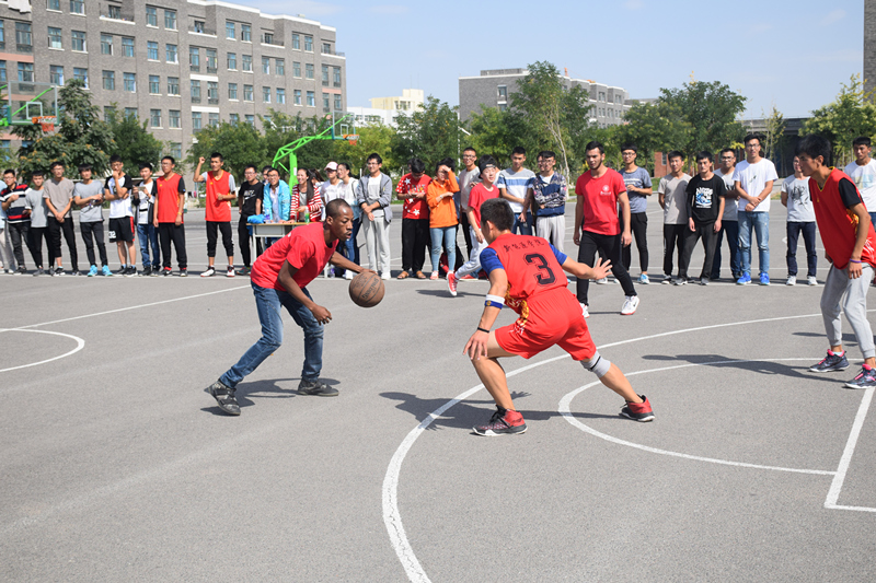 在籃球場(chǎng)上,留學(xué)生和學(xué)院學(xué)生展開(kāi)了籃球友誼交流賽,他們本著“友誼第一,比賽第二”的精神開(kāi)展籃球交流,經(jīng)過(guò)激烈的角逐,留學(xué)生代表隊(duì)以一分的優(yōu)勢(shì)獲勝。賽后,中外球員互相擁抱并合影留念。