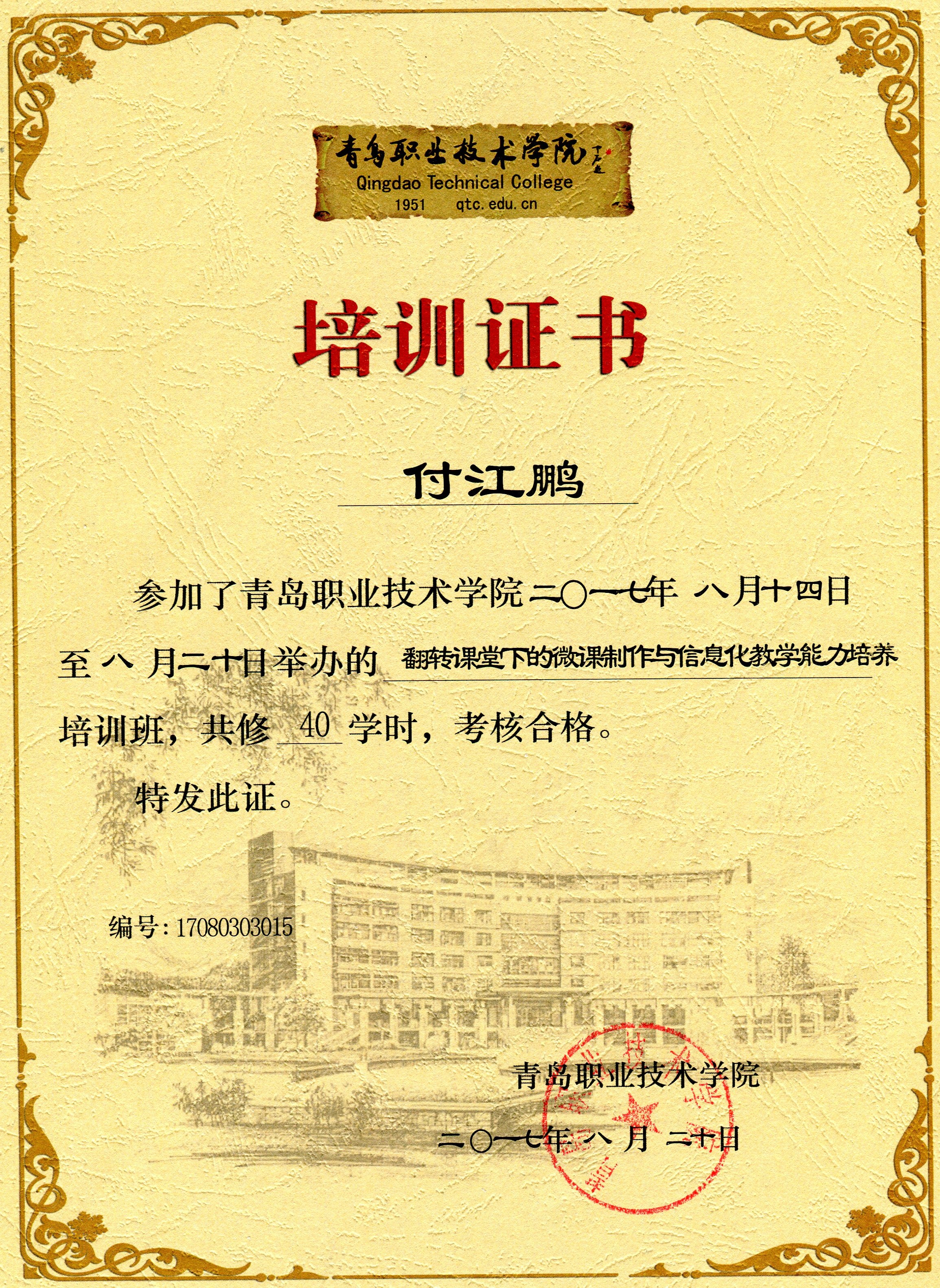 2017.8.14-8.20,我參加了由山東省教育廳在青島職業(yè)技術(shù)學(xué)院舉辦的《高校教師教學(xué)能力、信息技術(shù)與專(zhuān)業(yè)素養(yǎng)提升高級(jí)培訓(xùn)班》聯(lián)盟培訓(xùn)班。