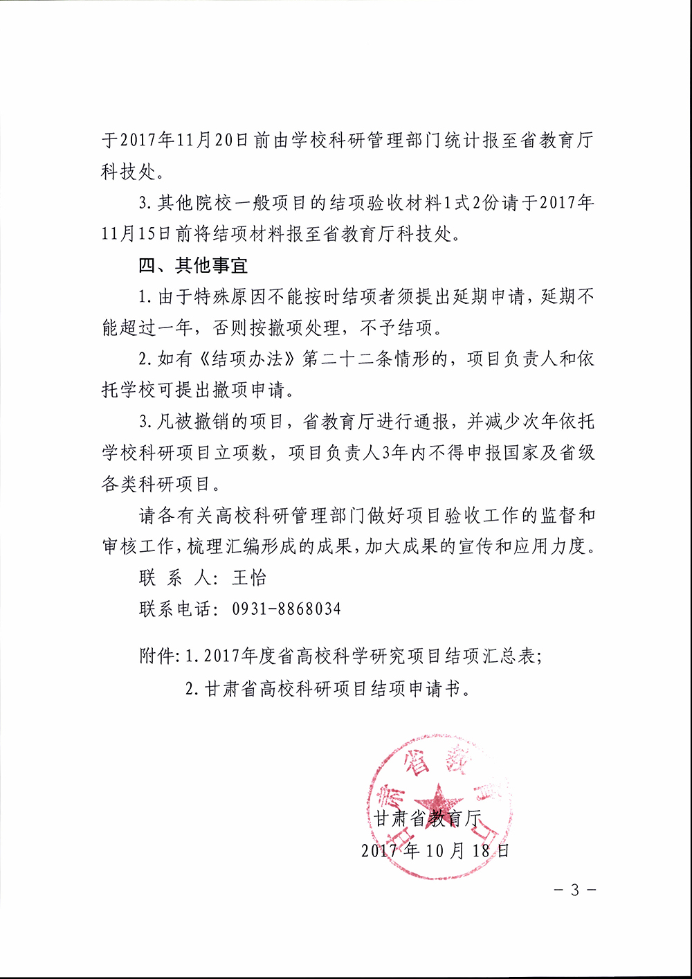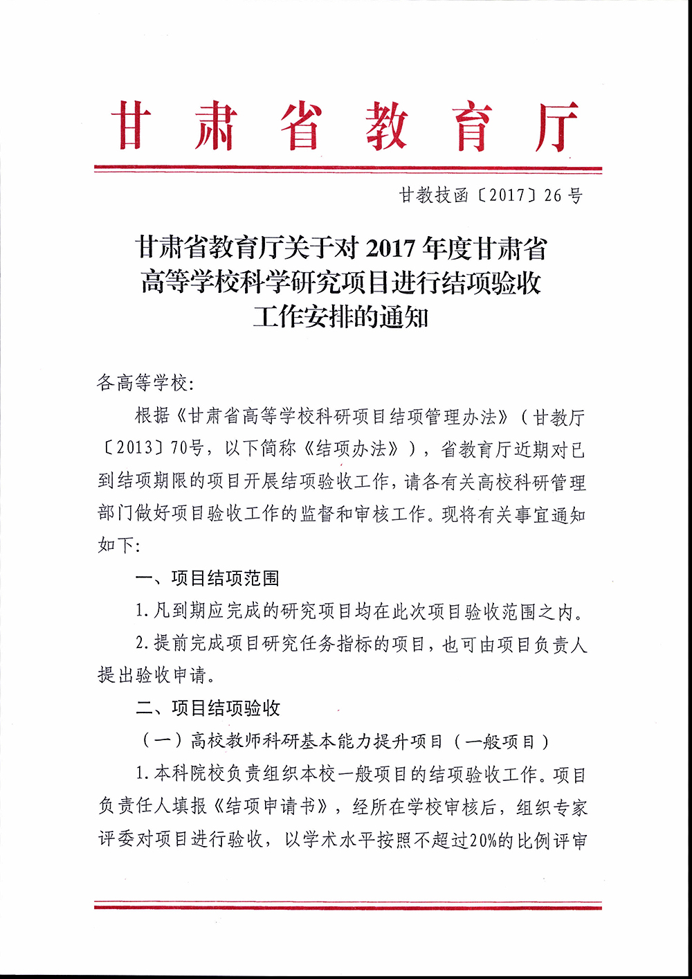 轉(zhuǎn)發(fā)甘肅省教育廳關(guān)于對2017年度甘肅省高等學(xué)校科學(xué)研究項(xiàng)目進(jìn)行結(jié)項(xiàng)驗(yàn)收工作安排的通知