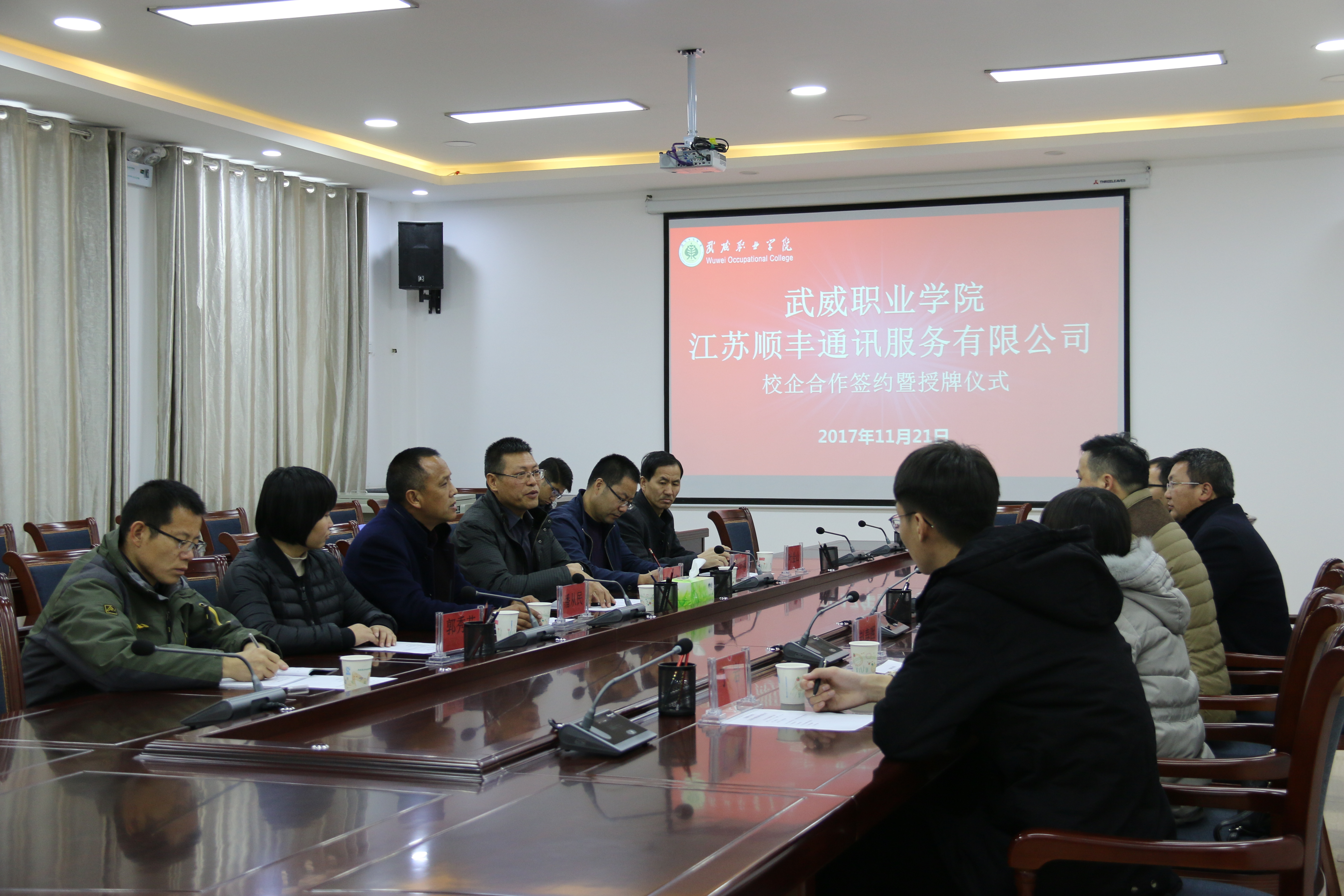 11月21日上午,經(jīng)濟(jì)管理系與江蘇順豐通訊服務(wù)有限公司校企合作簽約暨授牌儀式在行樹樓210會議室舉行。學(xué)院副院長王永緒、經(jīng)濟(jì)管理系黨總支書記潘從民、系主任張伯成,江蘇順豐通訊服務(wù)有限公司副總經(jīng)理張輝華、人力資源部招聘經(jīng)理高國軍及校企相關(guān)人員參加儀式。儀式由潘從民主持。